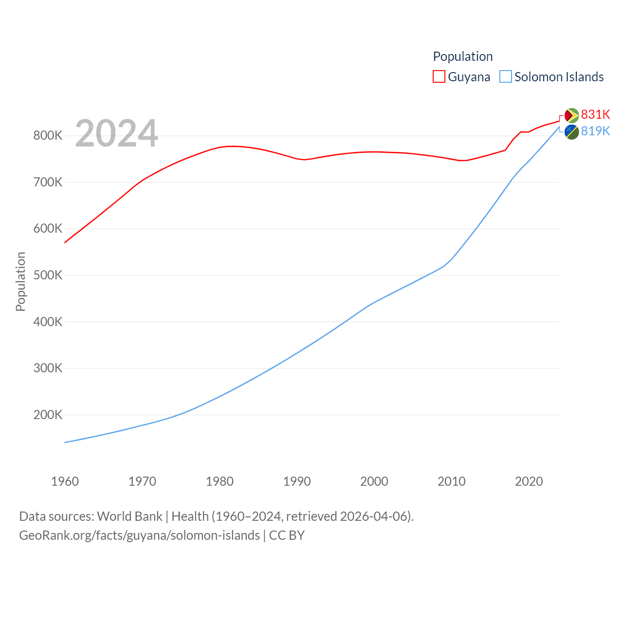Guyana has a population of 831K (ranked 161/197), compared with 819K in The Solomon Islands (ranked 162/197). Guyana's land area is 81,522 sq mi versus 10,807 sq mi for The Solomon Islands (ranked 82nd vs. 141st).