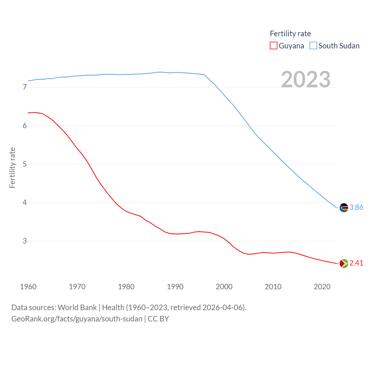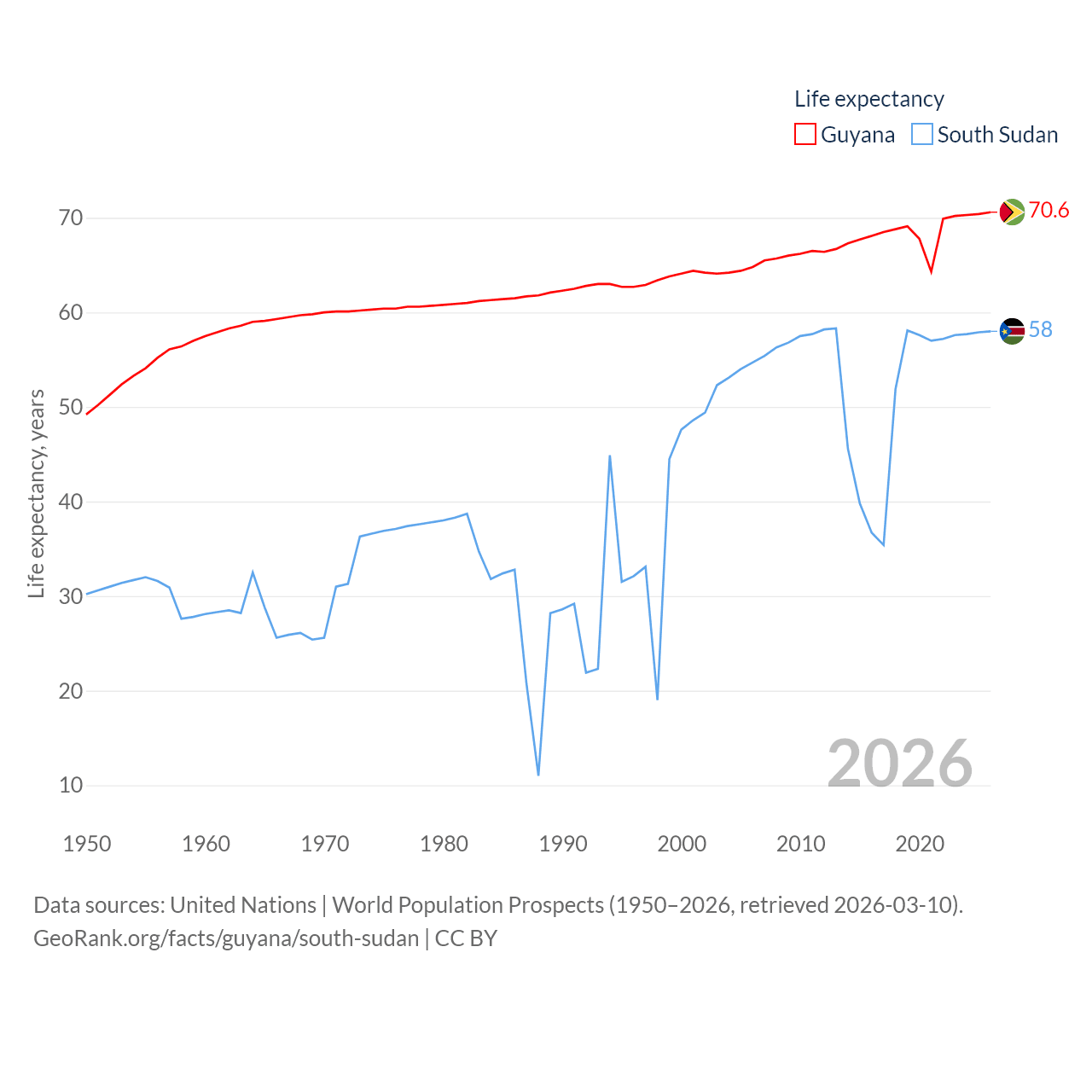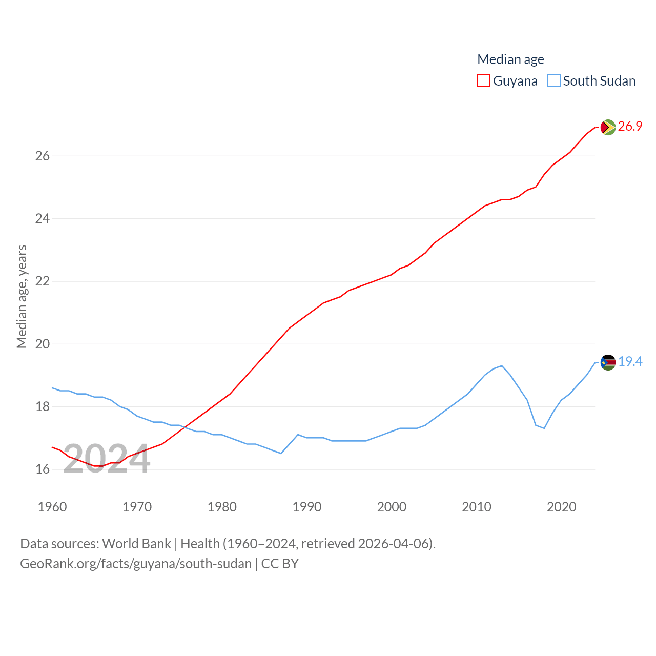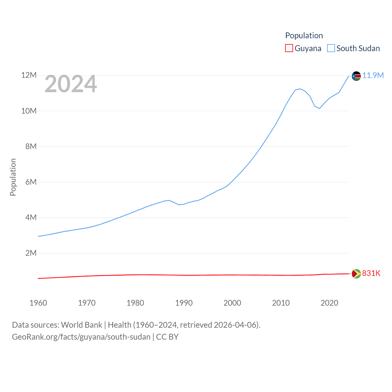 Guyana has a population of 831K (ranked 161/197), compared with 11.9M in South Sudan (ranked 81/197). Guyana's land area is 81,522 sq mi versus 243,990 sq mi for South Sudan (ranked 82nd vs. 41st).