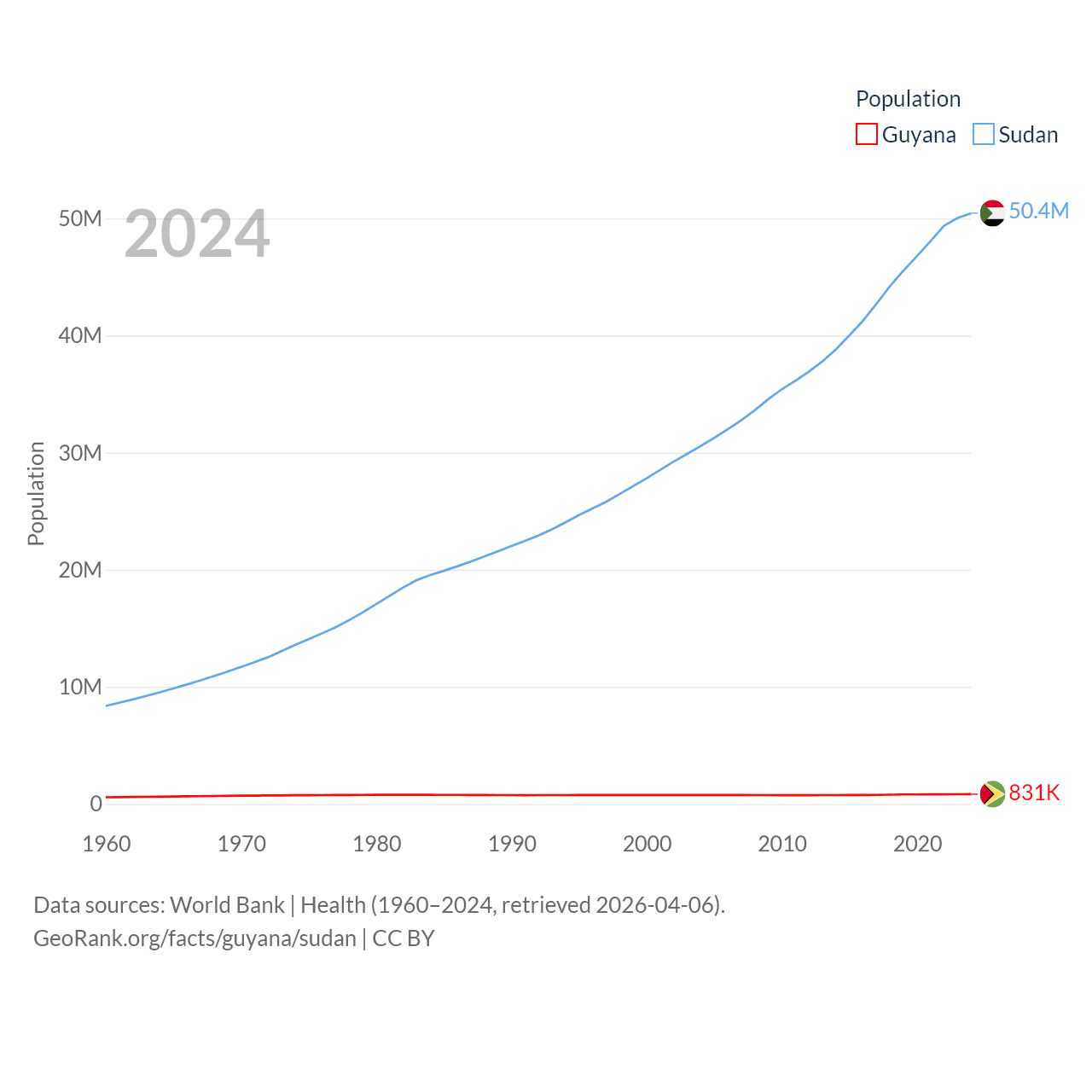 Guyana has a population of 831K (ranked 161/197), compared with 50.4M in Sudan (ranked 30/197). Guyana's land area is 81,522 sq mi versus 721,239 sq mi for Sudan (ranked 82nd vs. 15th).