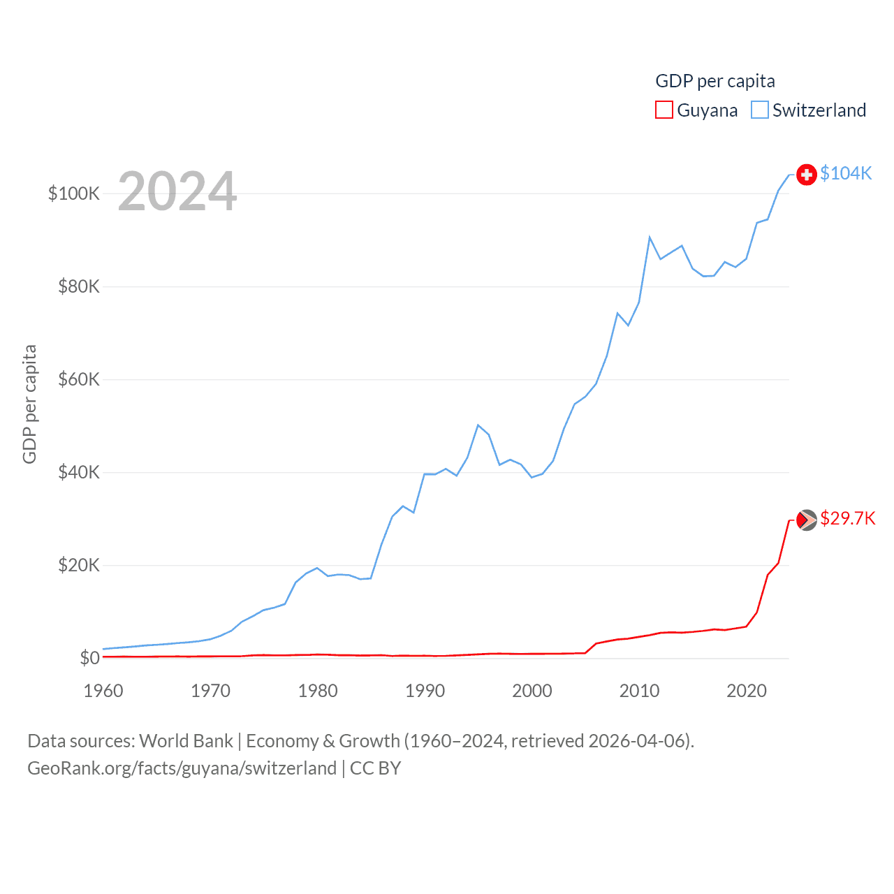 By GDP, Guyana ranks 120/197 ($24.7B) and Switzerland ranks 20/197 ($937B). By GDP per capita, Guyana ranks 41/197 ($29,675), while Switzerland ranks 5/197 ($103,998).
