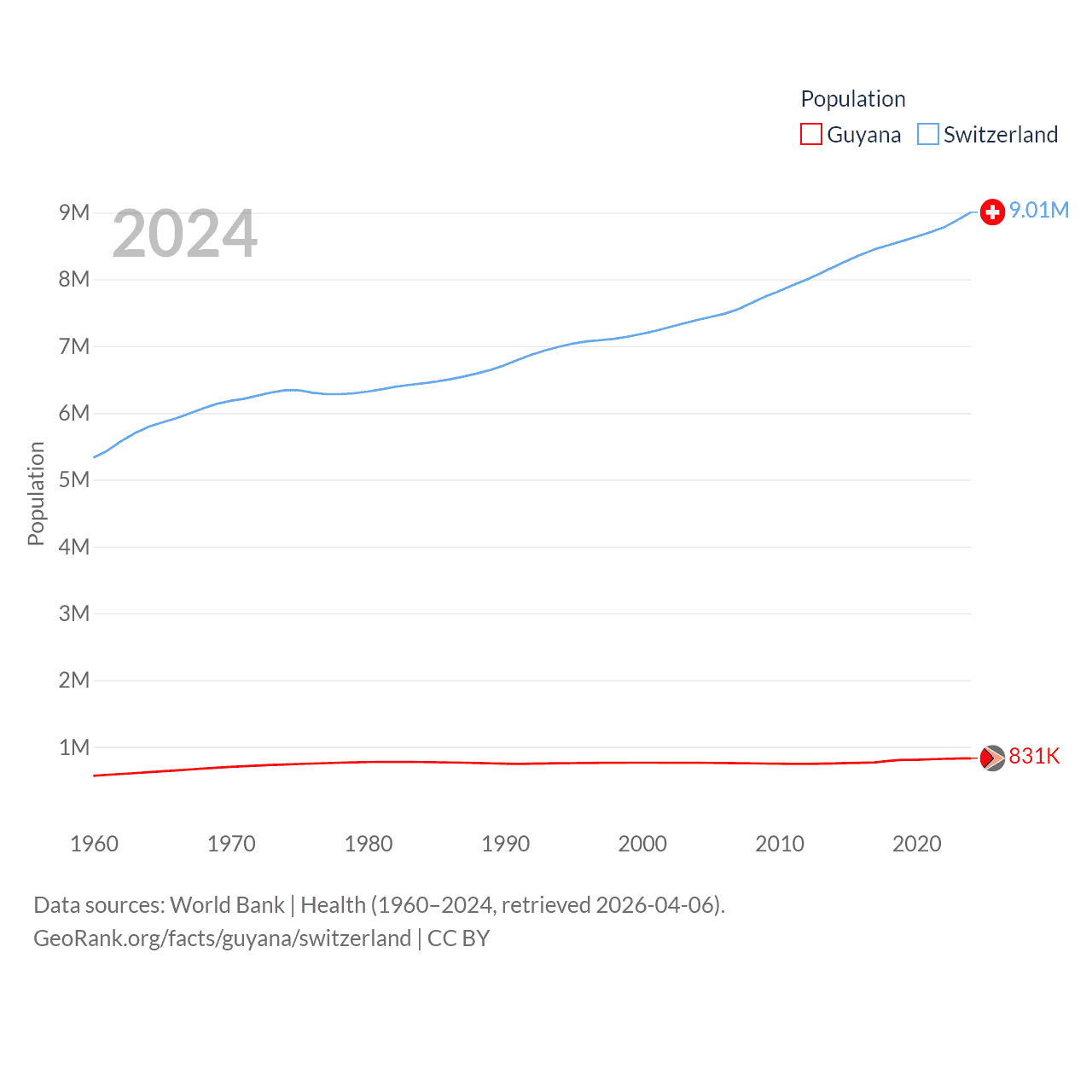 Guyana has a population of 831K (ranked 161/197), compared with 9.01M in Switzerland (ranked 101/197). Guyana's land area is 81,522 sq mi versus 15,255 sq mi for Switzerland (ranked 82nd vs. 131st).