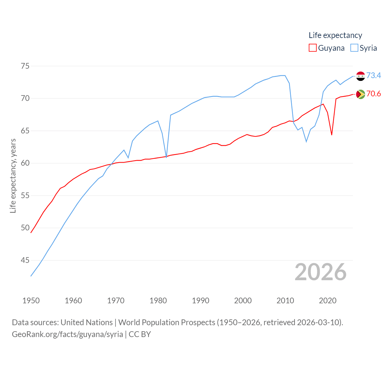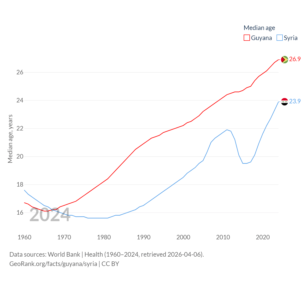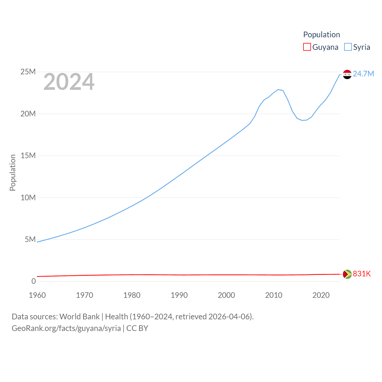 Guyana has a population of 831K (ranked 161/197), compared with 24.7M in Syria (ranked 57/197). Guyana's land area is 81,522 sq mi versus 70,900 sq mi for Syria (ranked 82nd vs. 87th).