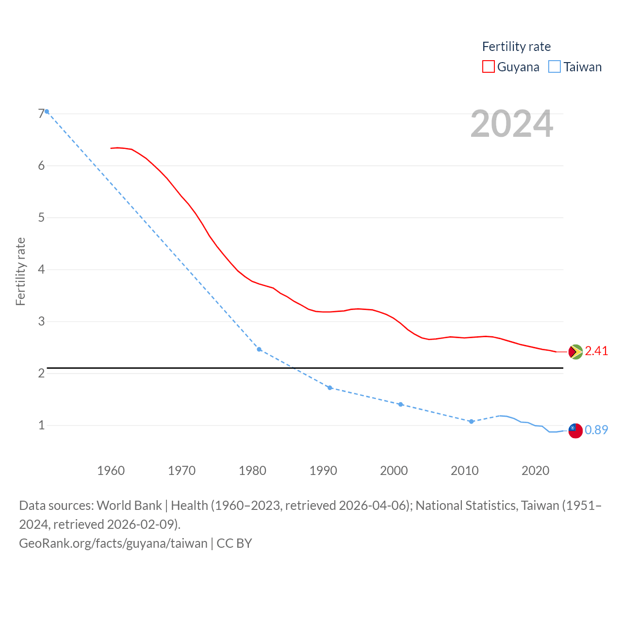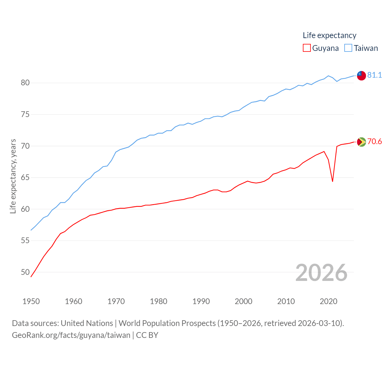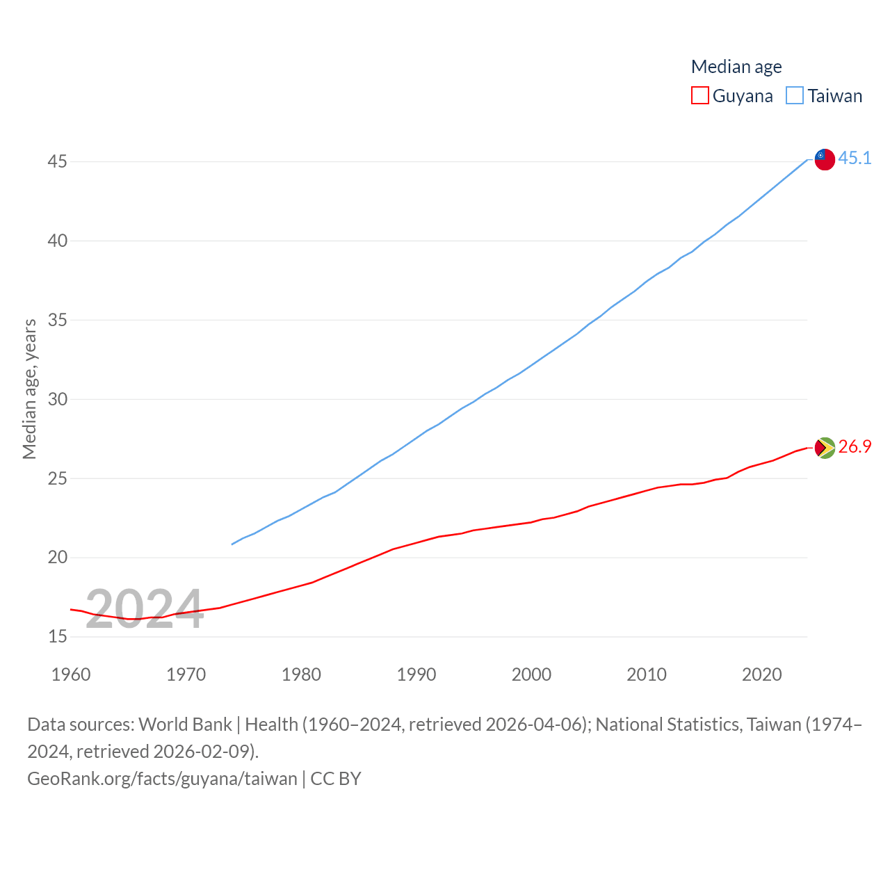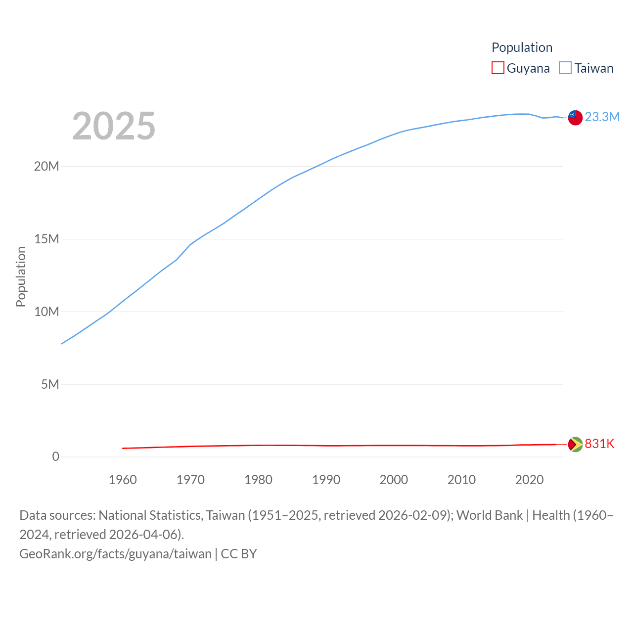 Guyana has a population of 831K (ranked 161/197), compared with 23.3M in Taiwan (ranked 60/197). Guyana's land area is 81,522 sq mi versus 13,976 sq mi for Taiwan (ranked 82nd vs. 133rd).