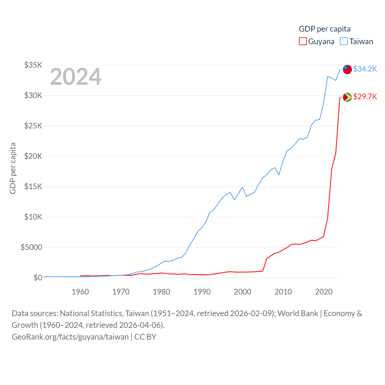 By GDP, Guyana ranks 120/197 ($24.7B) and Taiwan ranks 22/197 ($802B). By GDP per capita, Guyana ranks 41/197 ($29,675), while Taiwan ranks 35/197 ($34,238).