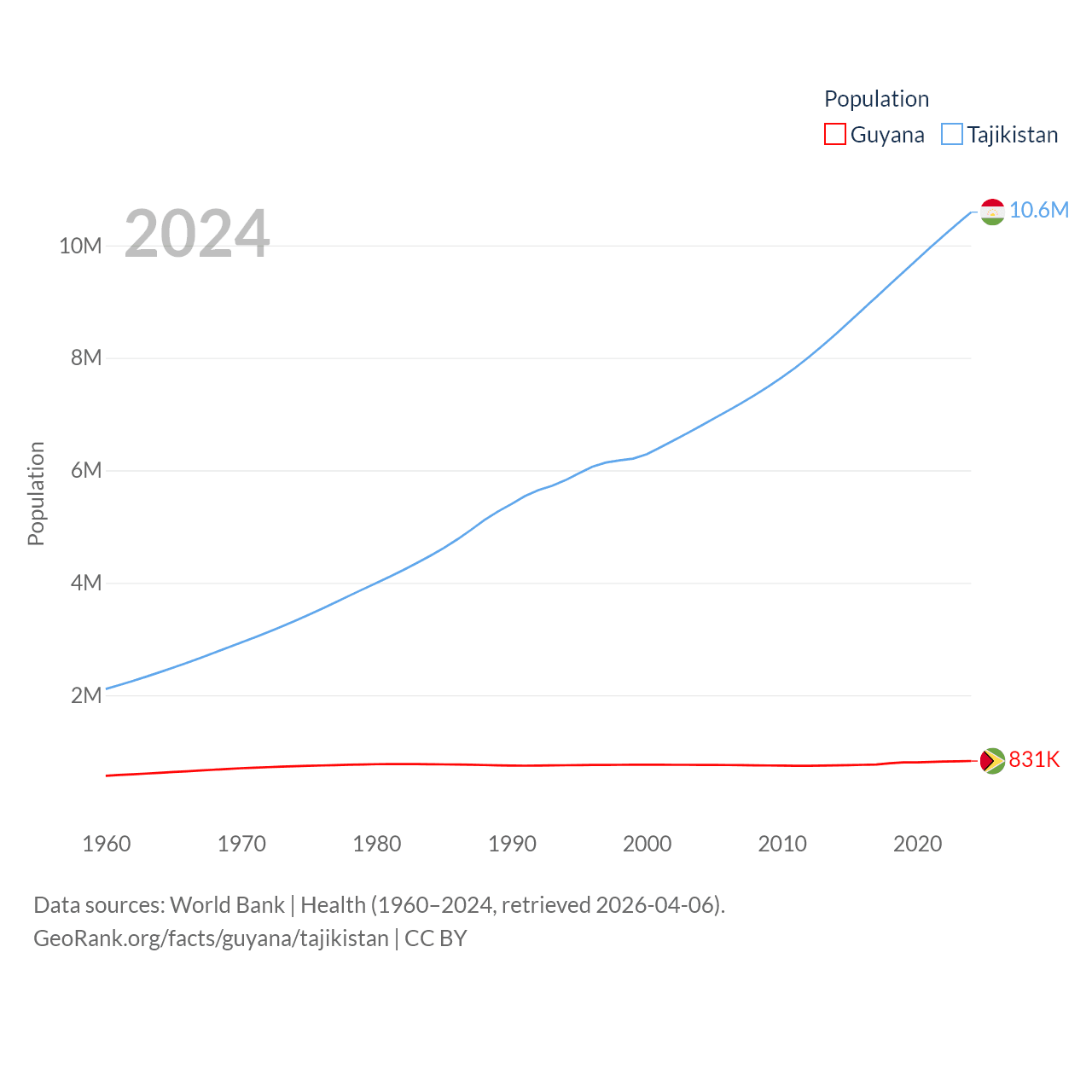 Guyana has a population of 831K (ranked 161/197), compared with 10.6M in Tajikistan (ranked 91/197). Guyana's land area is 81,522 sq mi versus 53,587 sq mi for Tajikistan (ranked 82nd vs. 93rd).