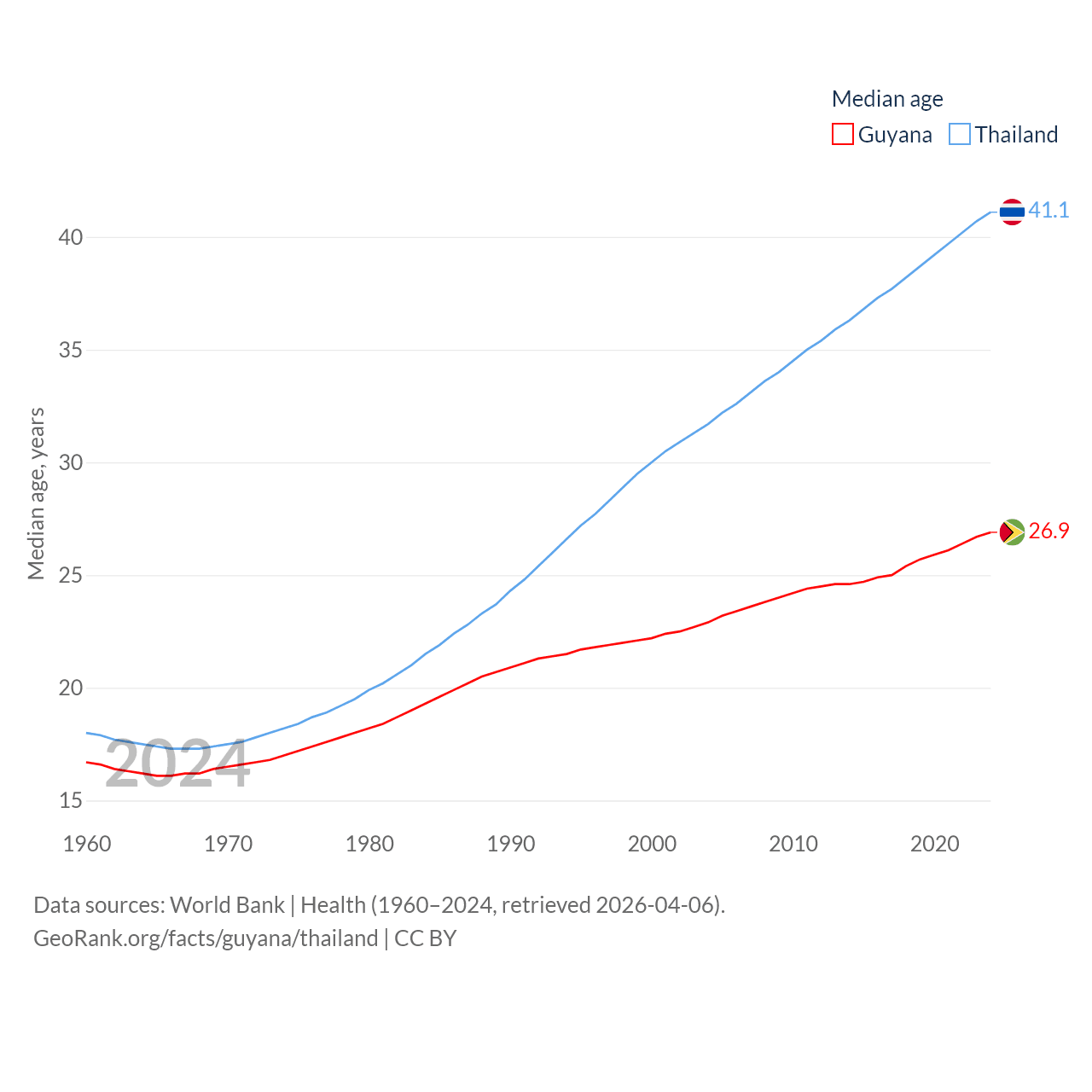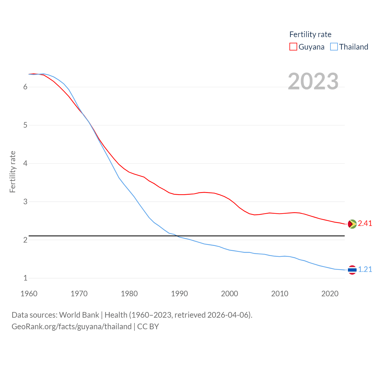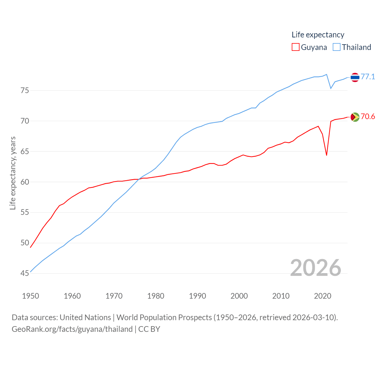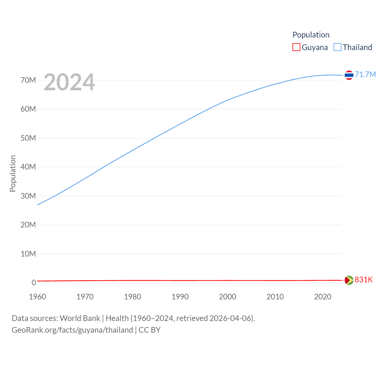 Guyana has a population of 831K (ranked 161/197), compared with 71.7M in Thailand (ranked 20/197). Guyana's land area is 81,522 sq mi versus 197,256 sq mi for Thailand (ranked 82nd vs. 50th).