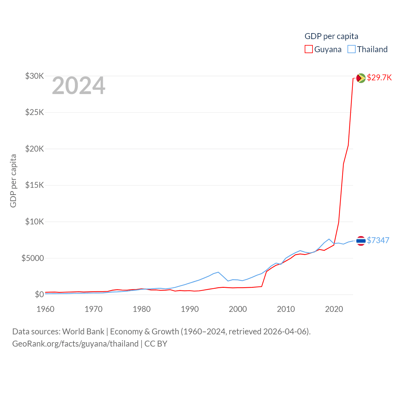 By GDP, Guyana ranks 120/197 ($24.7B) and Thailand ranks 31/197 ($527B). By GDP per capita, Guyana ranks 41/197 ($29,675), while Thailand ranks 100/197 ($7,347).