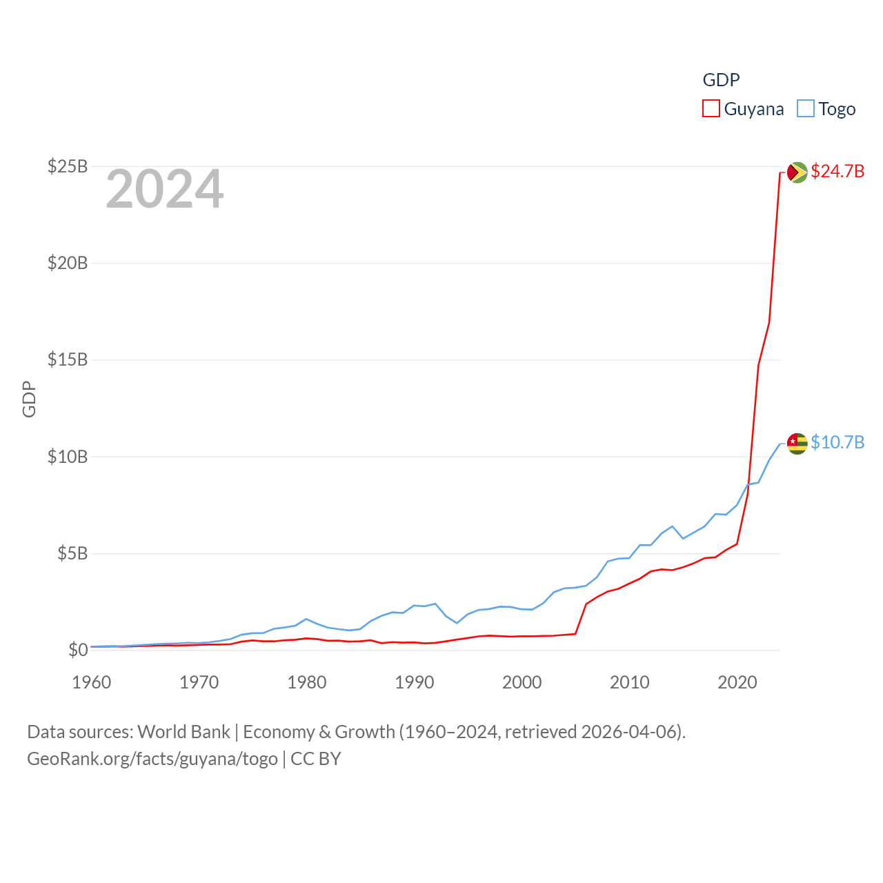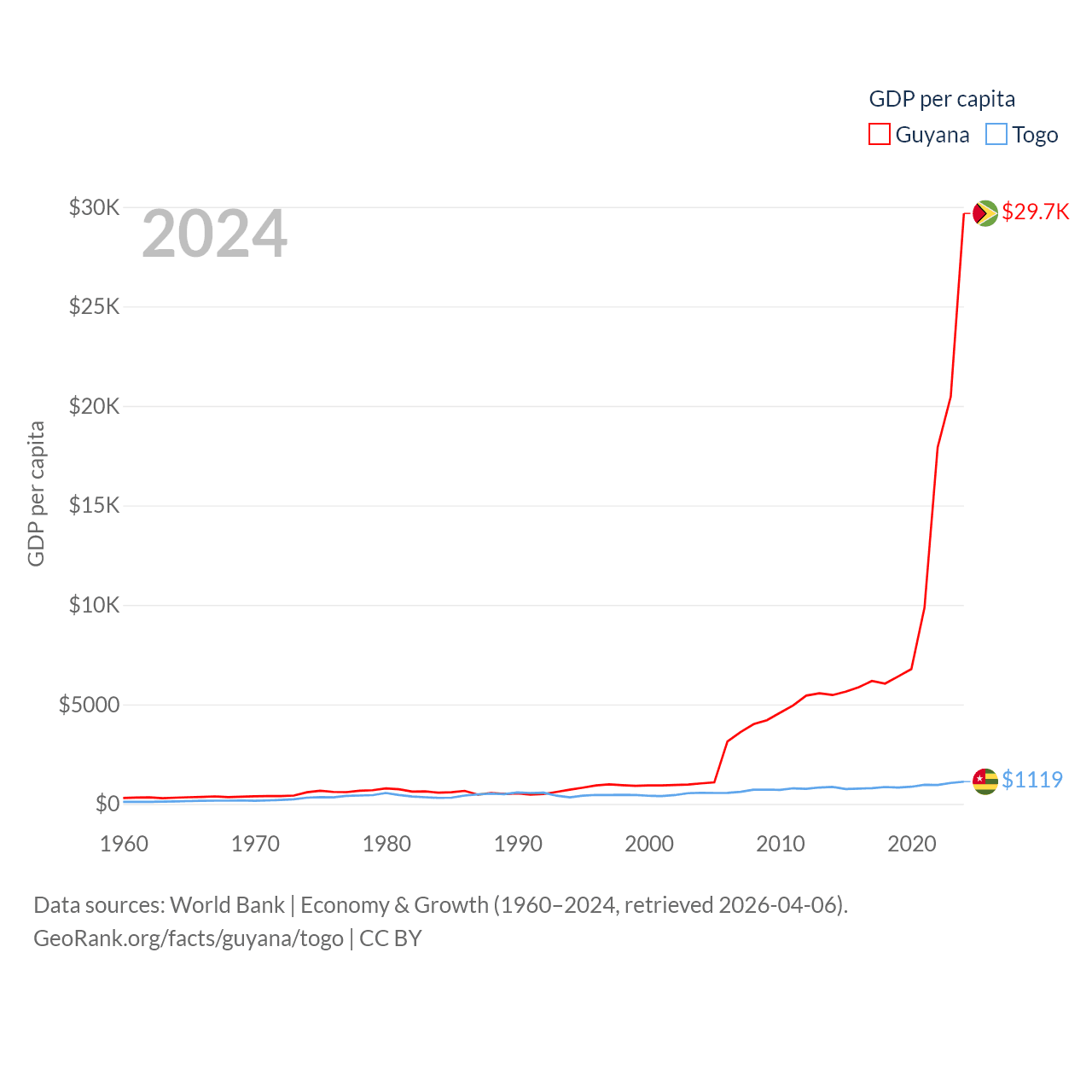 By GDP, Guyana ranks 120/197 ($24.7B) and Togo ranks 154/197 ($10.7B). By GDP per capita, Guyana ranks 41/197 ($29,675), while Togo ranks 172/197 ($1,119).