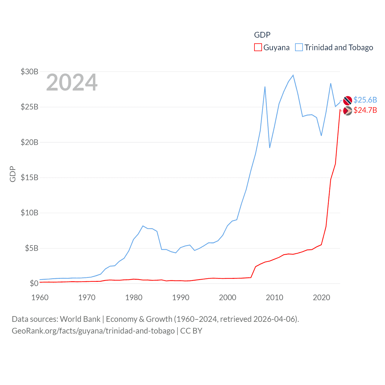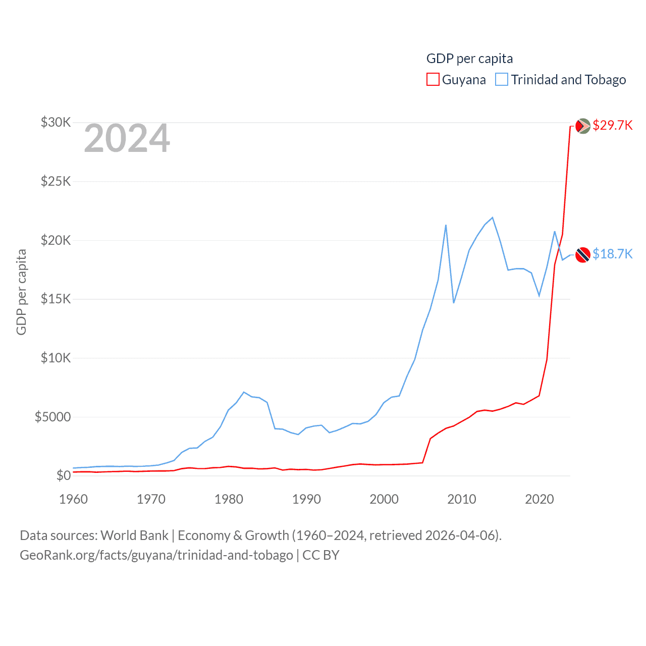 By GDP, Guyana ranks 120/197 ($24.7B) and Trinidad and Tobago ranks 115/197 ($25.6B). By GDP per capita, Guyana ranks 41/197 ($29,675), while Trinidad and Tobago ranks 61/197 ($18,733).