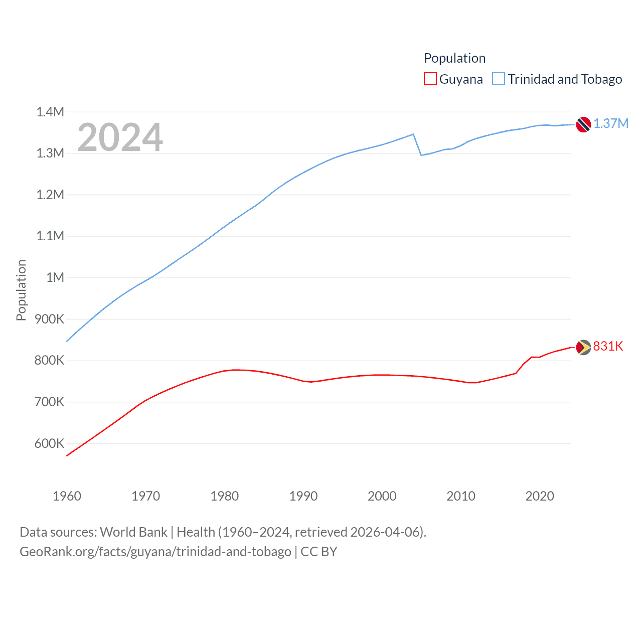 Guyana has a population of 831K (ranked 161/197), compared with 1.37M in Trinidad and Tobago (ranked 154/197). Guyana's land area is 81,522 sq mi versus 1,981 sq mi for Trinidad and Tobago (ranked 82nd vs. 166th).