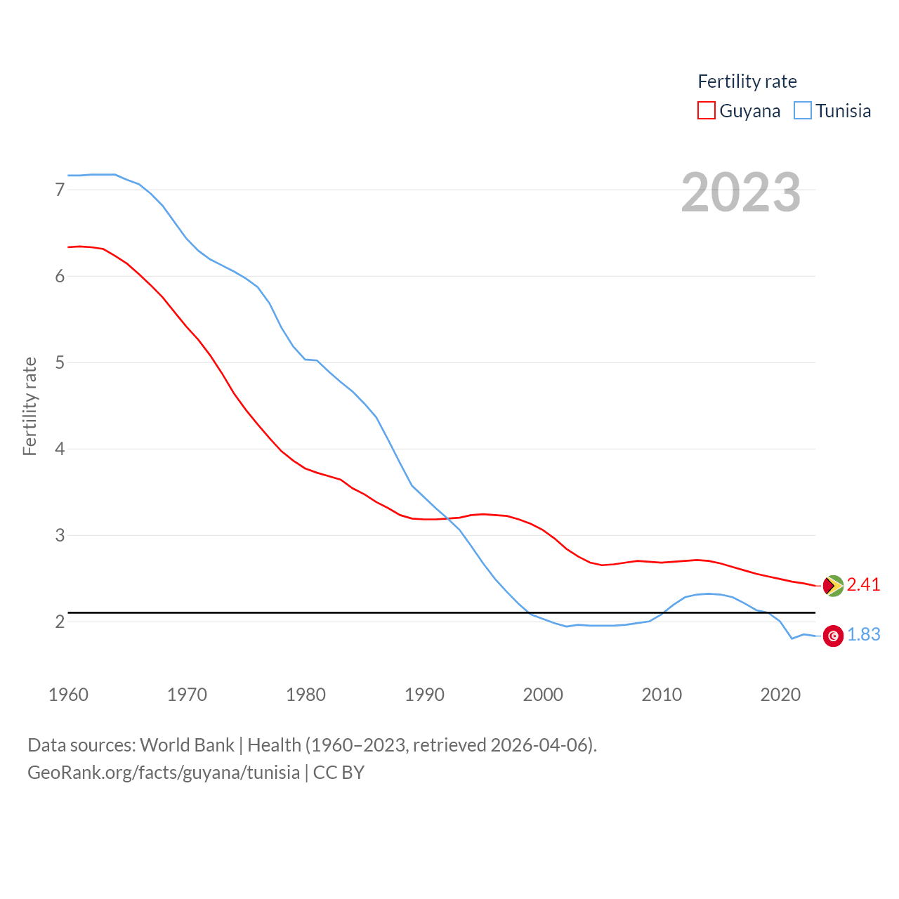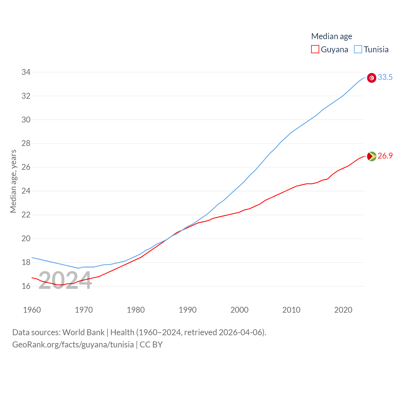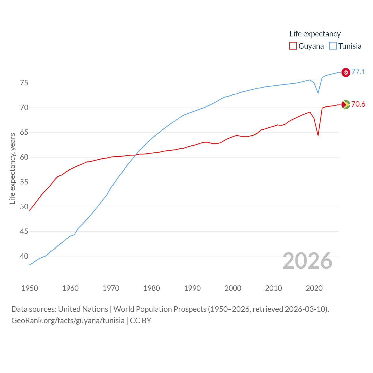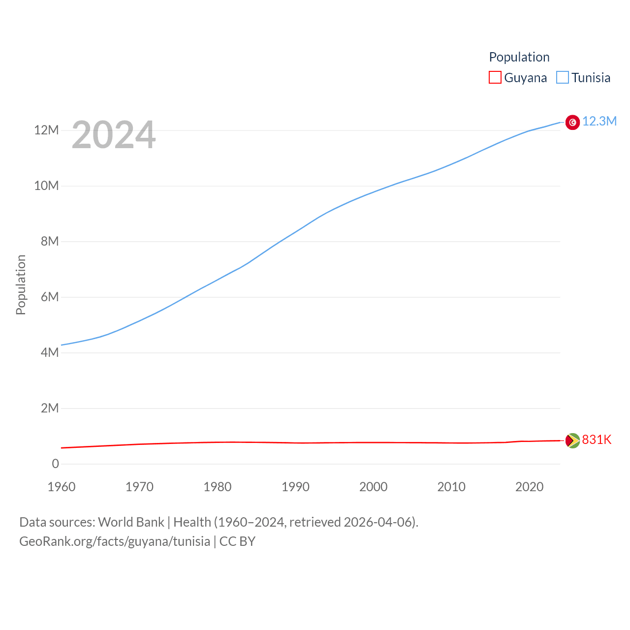 Guyana has a population of 831K (ranked 161/197), compared with 12.3M in Tunisia (ranked 80/197). Guyana's land area is 81,522 sq mi versus 59,985 sq mi for Tunisia (ranked 82nd vs. 91st).
