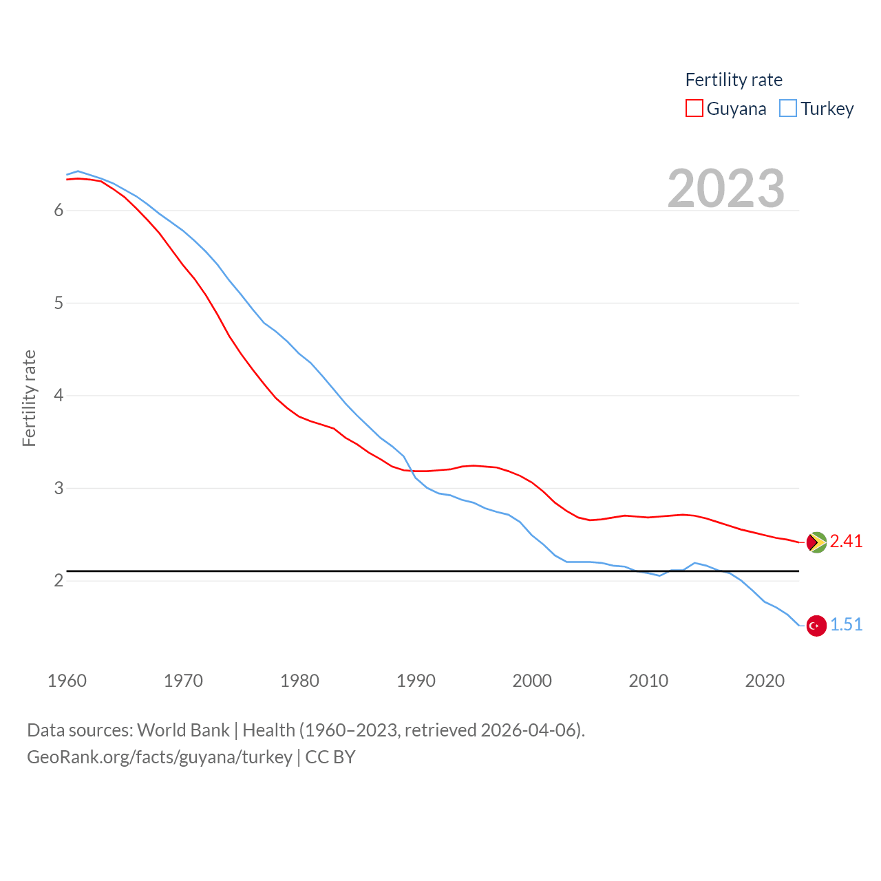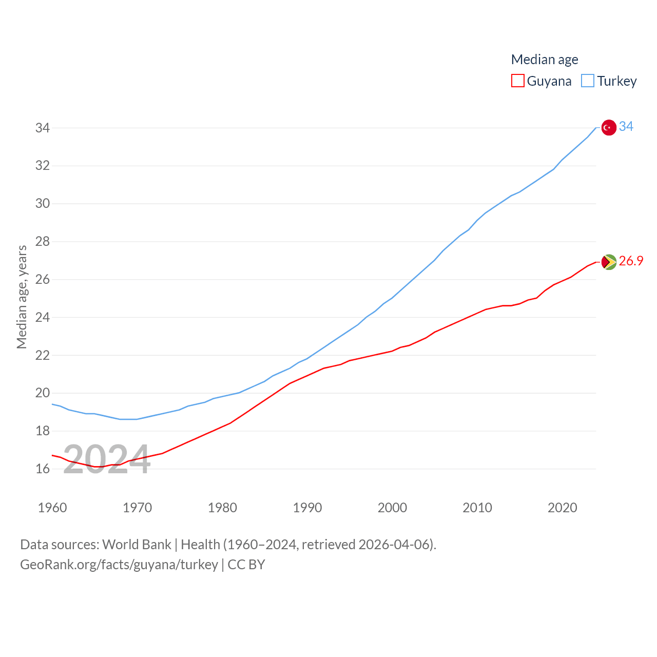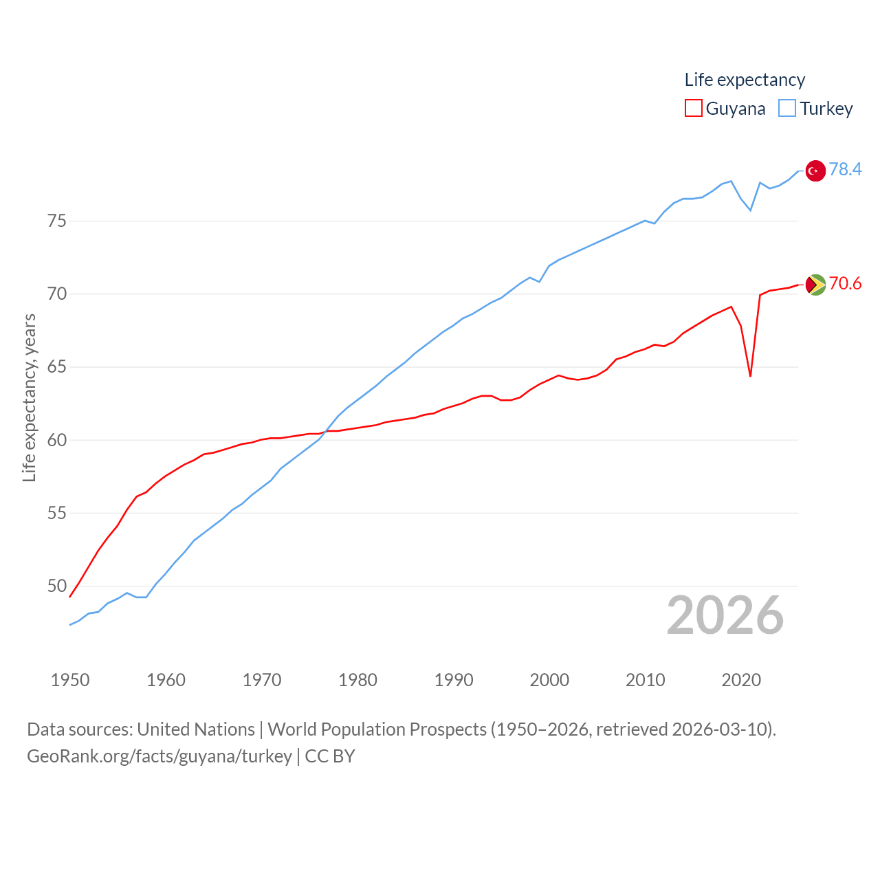 Guyana has a population of 831K (ranked 161/197), compared with 85.5M in Turkey (ranked 18/197). Guyana's land area is 81,522 sq mi versus 297,156 sq mi for Turkey (ranked 82nd vs. 36th).