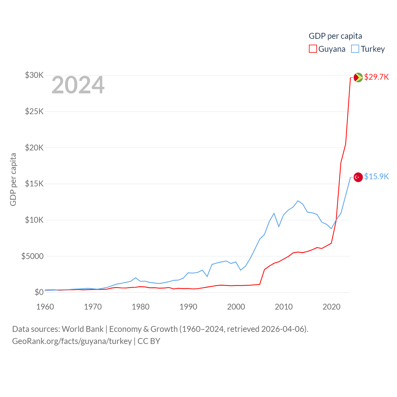 By GDP, Guyana ranks 120/197 ($24.7B) and Turkey ranks 17/197 ($1.36T). By GDP per capita, Guyana ranks 41/197 ($29,675), while Turkey ranks 66/197 ($15,893).