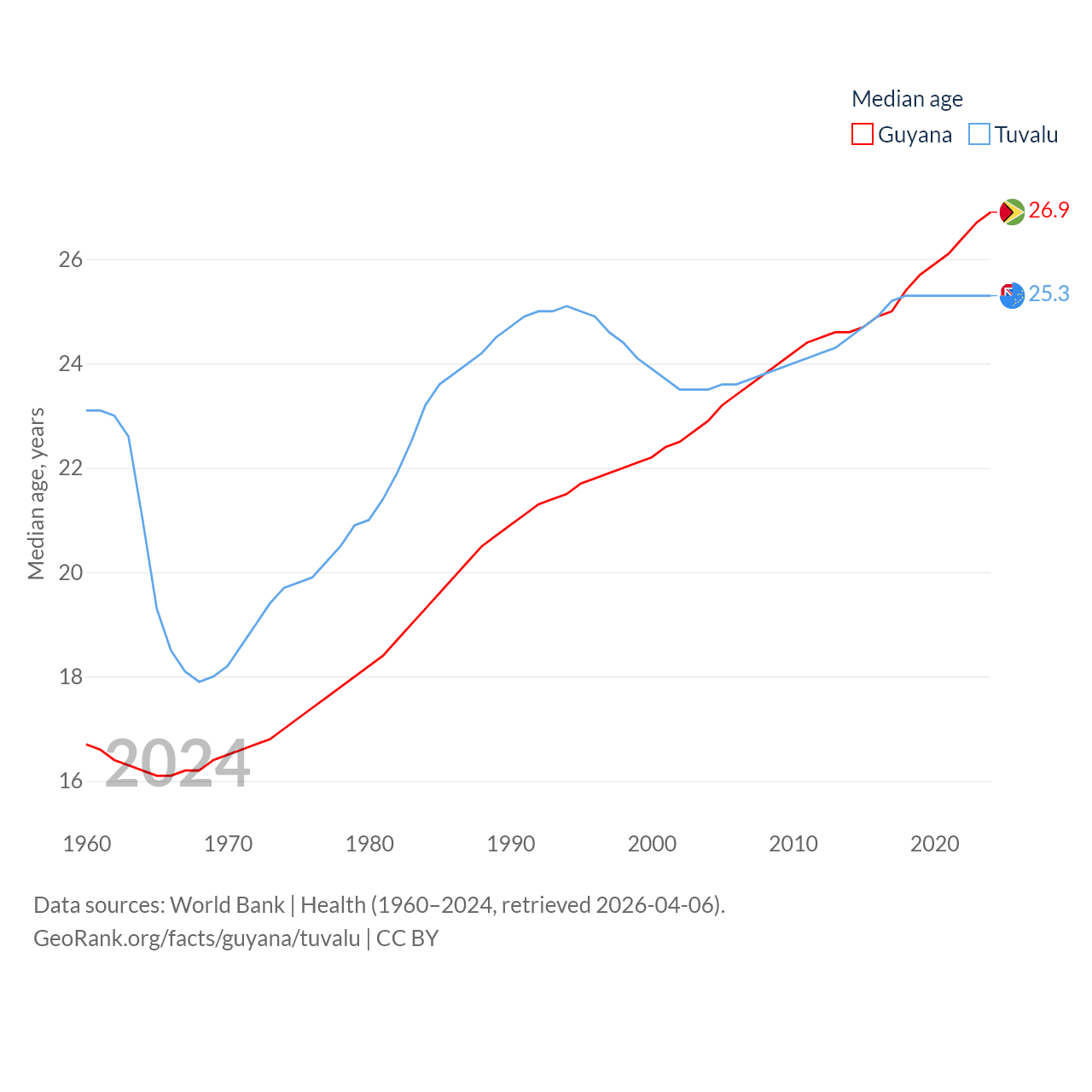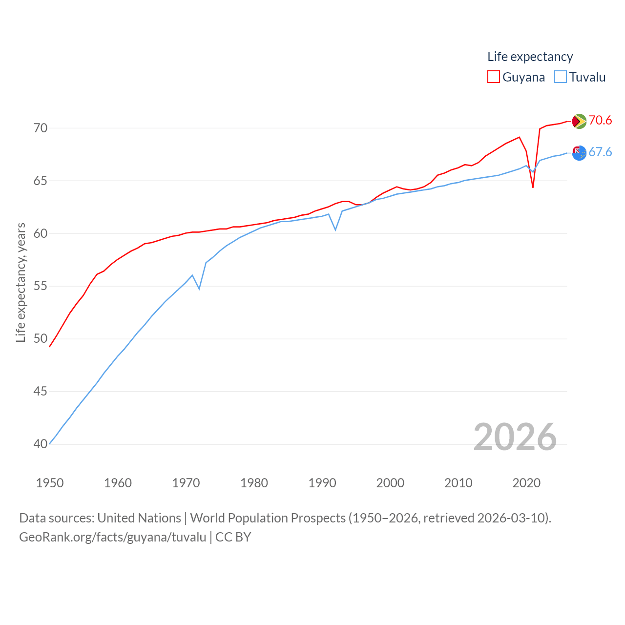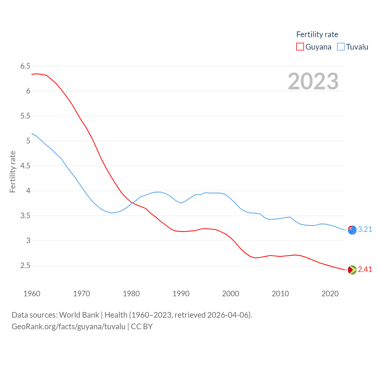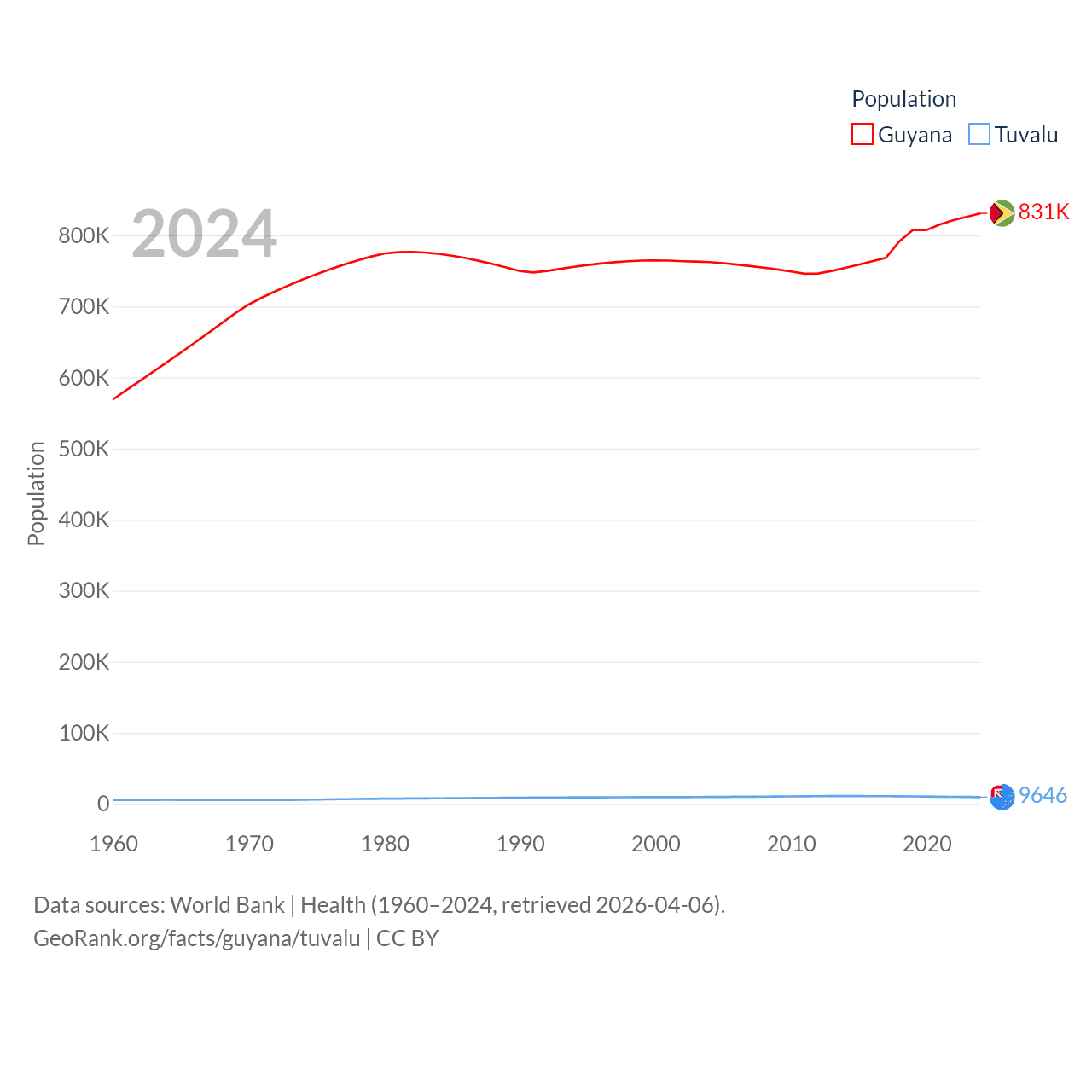 Guyana has a population of 831K (ranked 161/197), compared with 9.65K in Tuvalu (ranked 196/197). Guyana's land area is 81,522 sq mi versus 11.6 sq mi for Tuvalu (ranked 82nd vs. 194th).