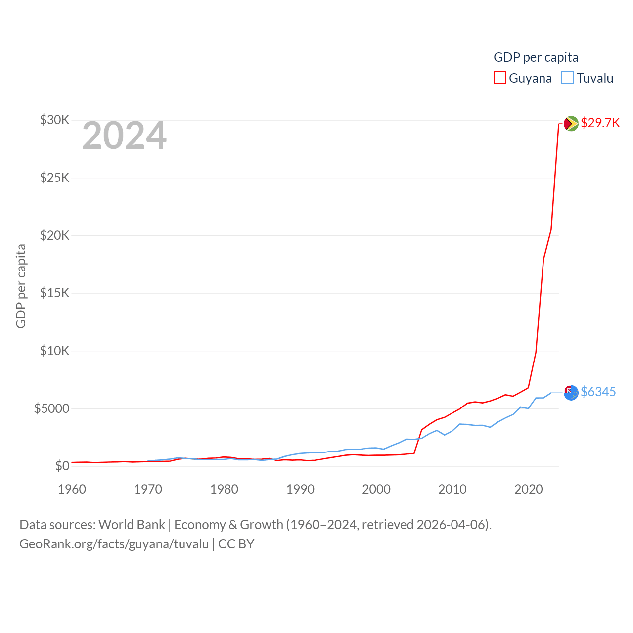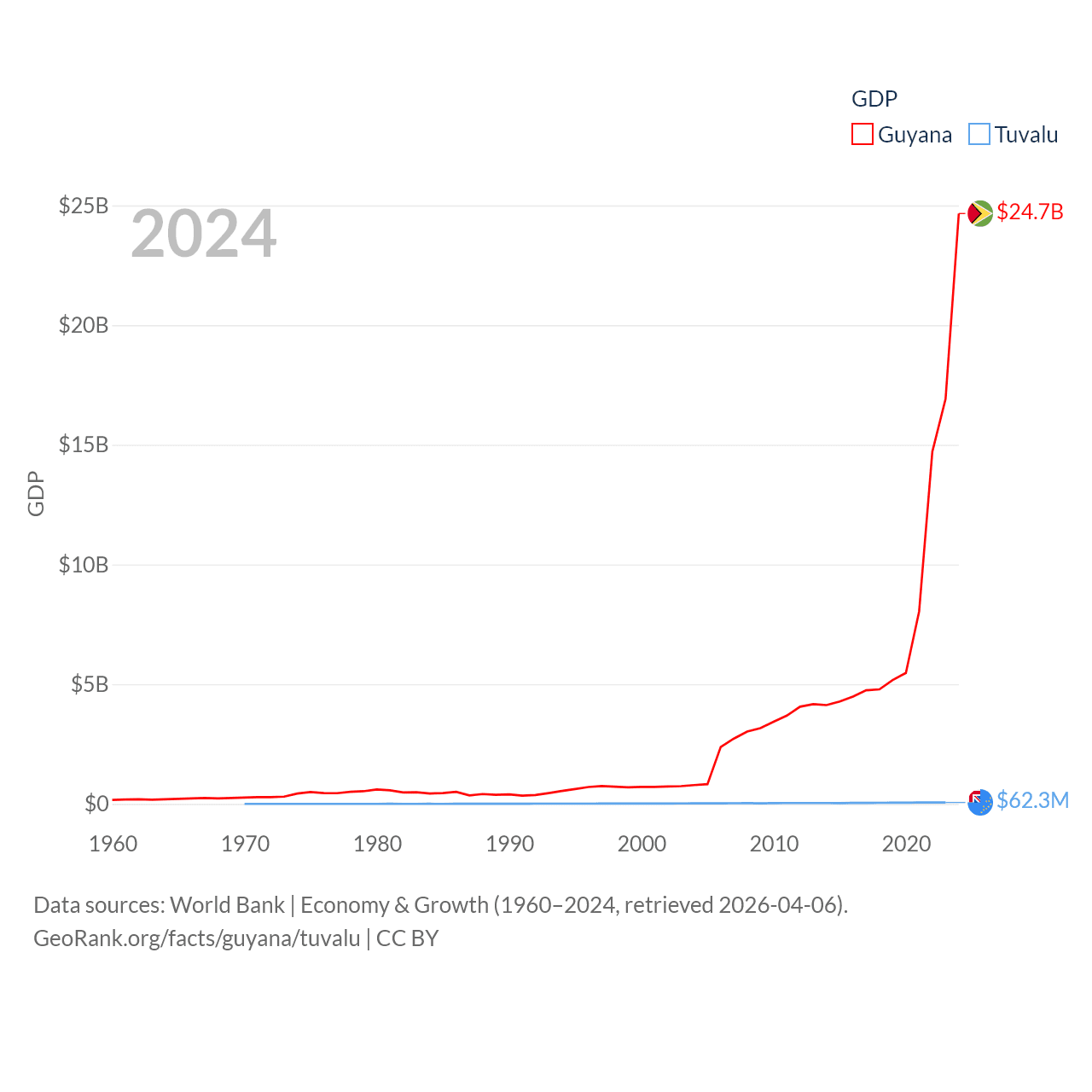 By GDP, Guyana ranks 120/197 ($24.7B) and Tuvalu ranks 196/197 ($62.3M). By GDP per capita, Guyana ranks 41/197 ($29,675), while Tuvalu ranks 110/197 ($6,345).