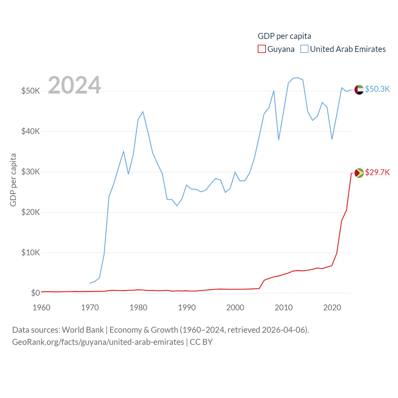 By GDP, Guyana ranks 120/197 ($24.7B) and The United Arab Emirates ranks 27/197 ($552B). By GDP per capita, Guyana ranks 41/197 ($29,675), while The United Arab Emirates ranks 24/197 ($50,274).