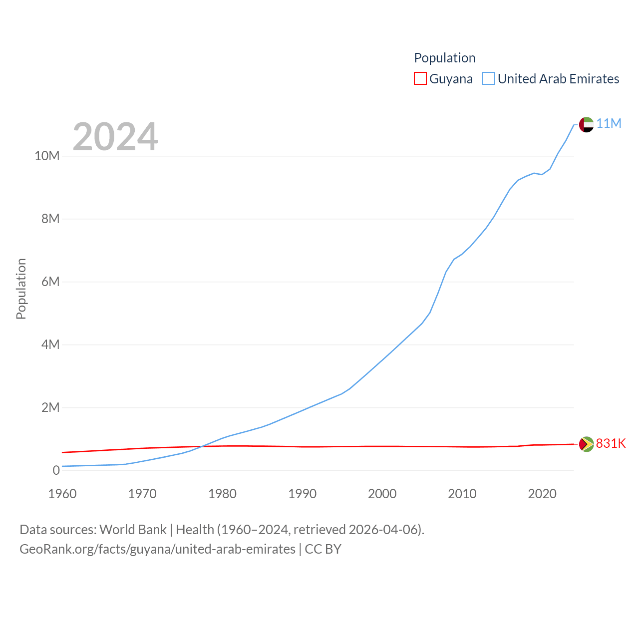 Guyana has a population of 831K (ranked 161/197), compared with 11M in The United Arab Emirates (ranked 86/197). Guyana's land area is 81,522 sq mi versus 27,421 sq mi for The United Arab Emirates (ranked 82nd vs. 117th).