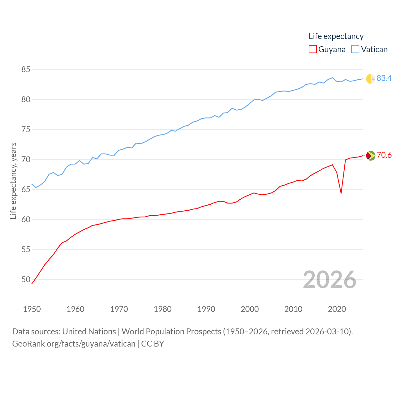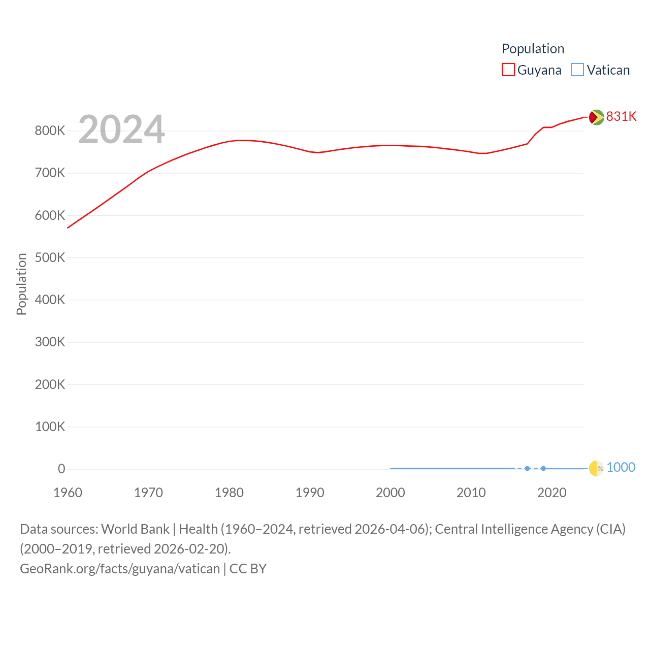 Guyana has a population of 831K (ranked 161/197), compared with 1K in The Vatican (ranked 197/197). Guyana's land area is 81,522 sq mi versus 0.17 sq mi for The Vatican (ranked 82nd vs. 197th).
