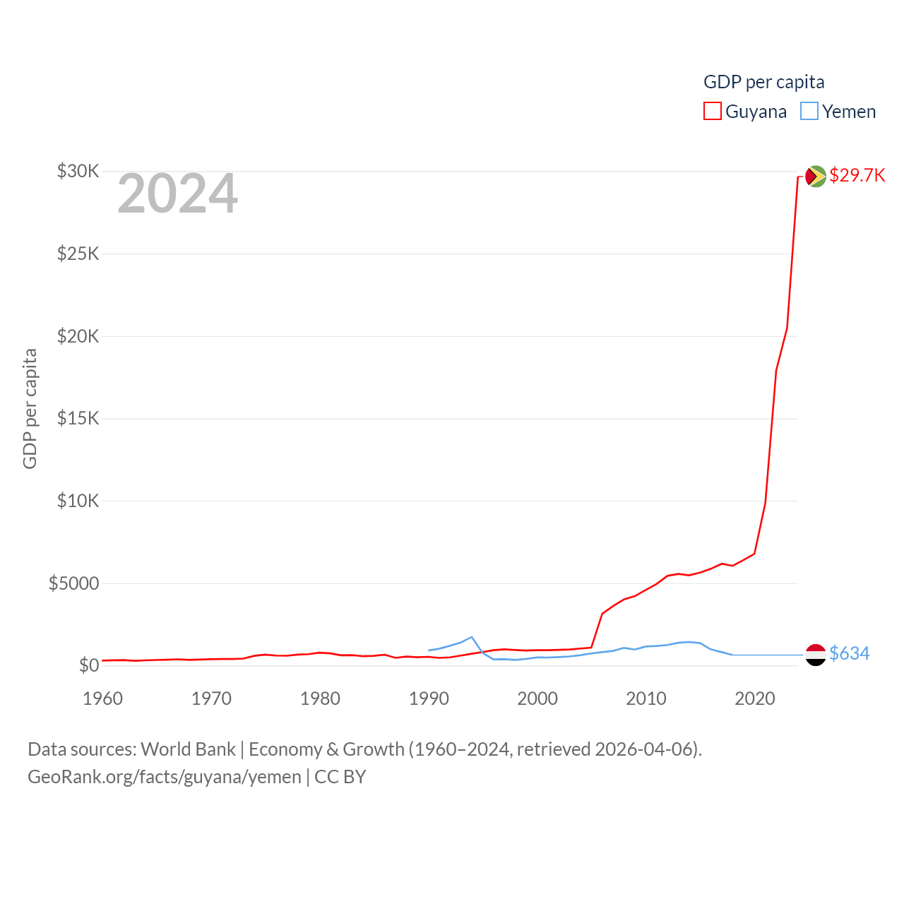 By GDP, Guyana ranks 120/197 ($24.7B) and Yemen ranks 125/197 ($21.6B). By GDP per capita, Guyana ranks 41/197 ($29,675), while Yemen ranks 191/197 ($634).