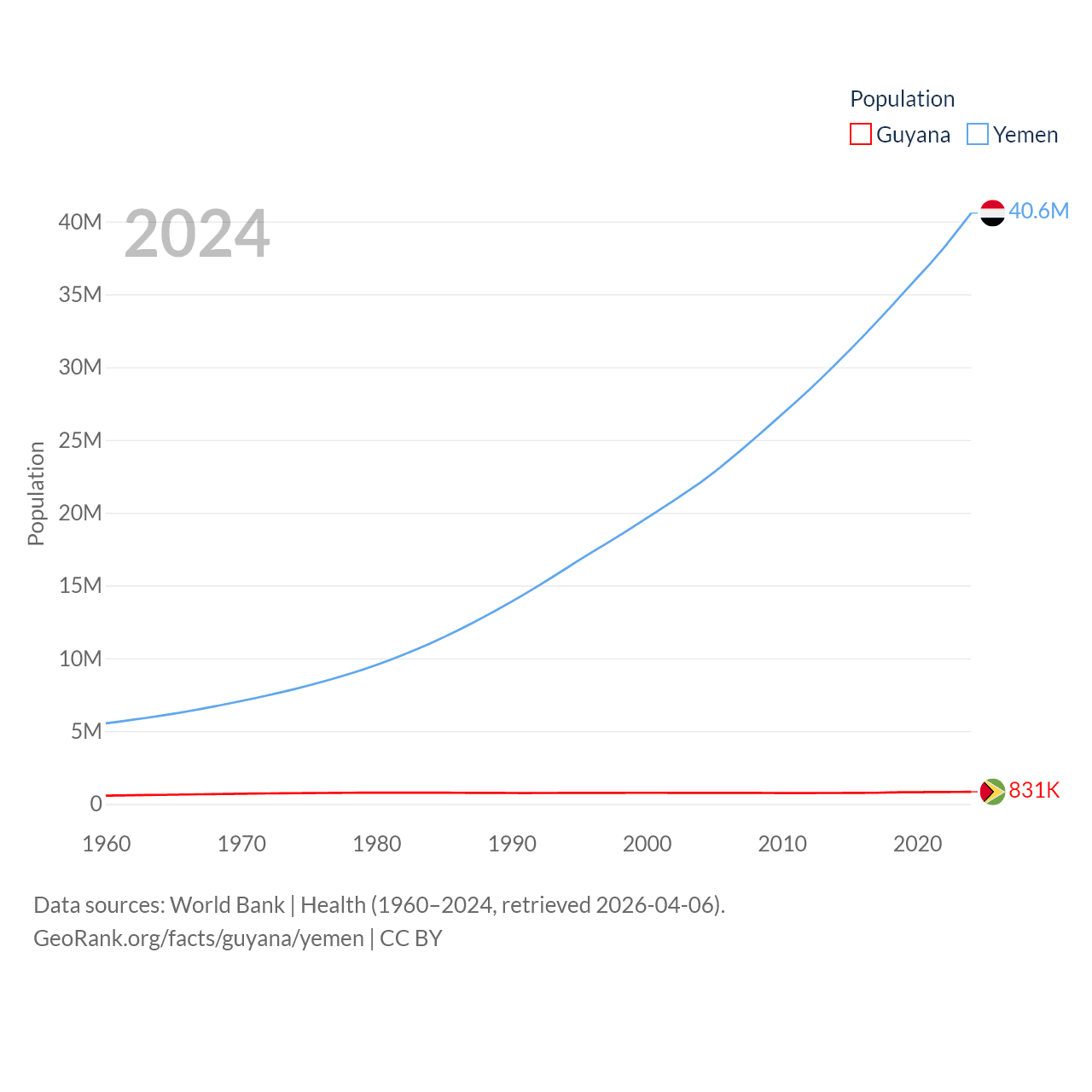 Guyana has a population of 831K (ranked 161/197), compared with 40.6M in Yemen (ranked 38/197). Guyana's land area is 81,522 sq mi versus 203,850 sq mi for Yemen (ranked 82nd vs. 49th).