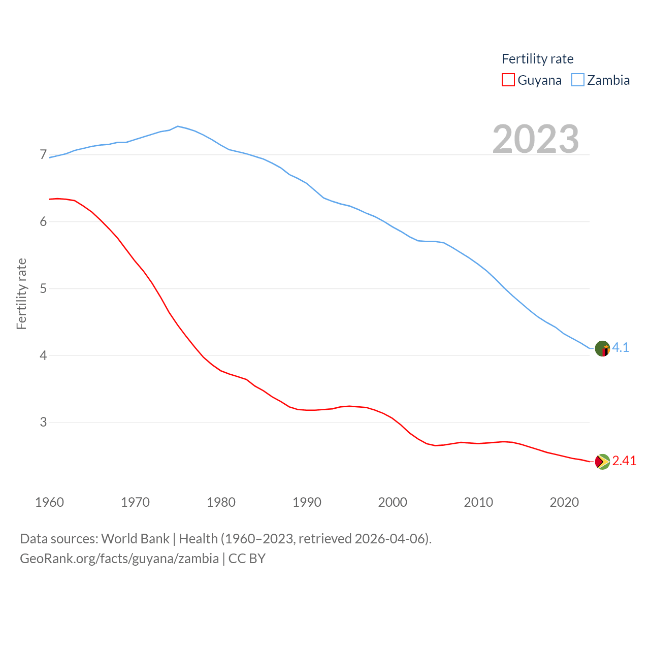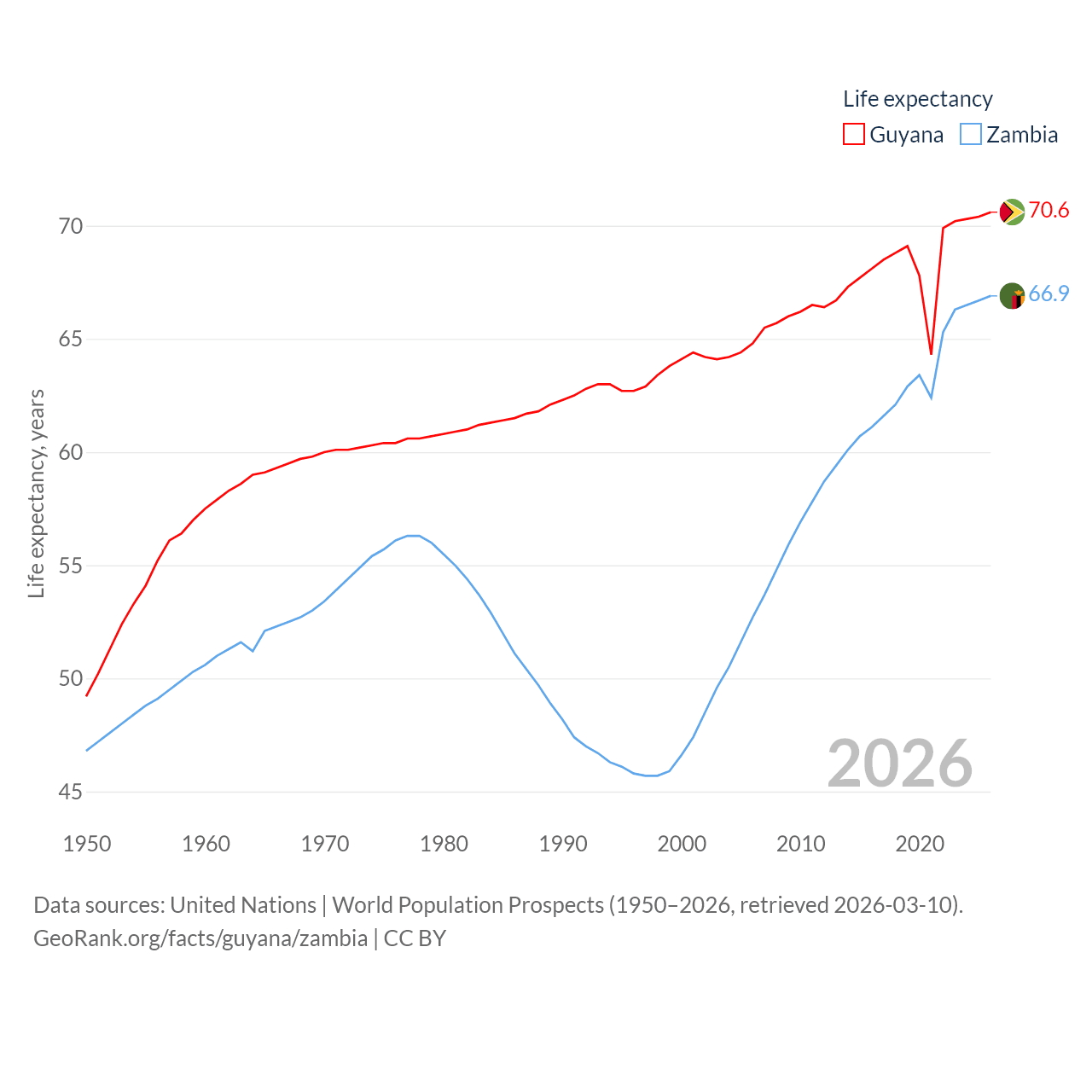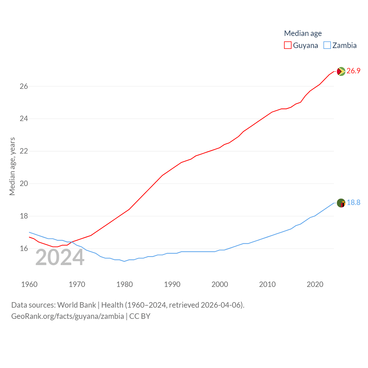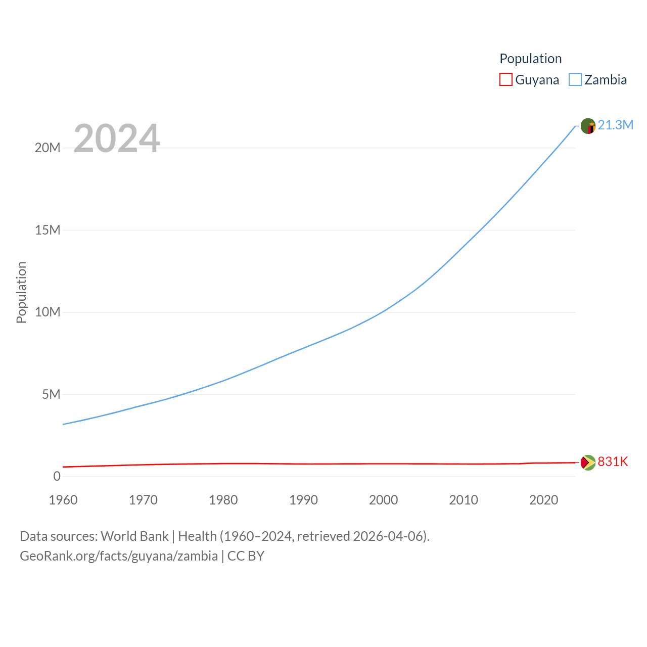 Guyana has a population of 831K (ranked 161/197), compared with 21.3M in Zambia (ranked 63/197). Guyana's land area is 81,522 sq mi versus 287,024 sq mi for Zambia (ranked 82nd vs. 37th).