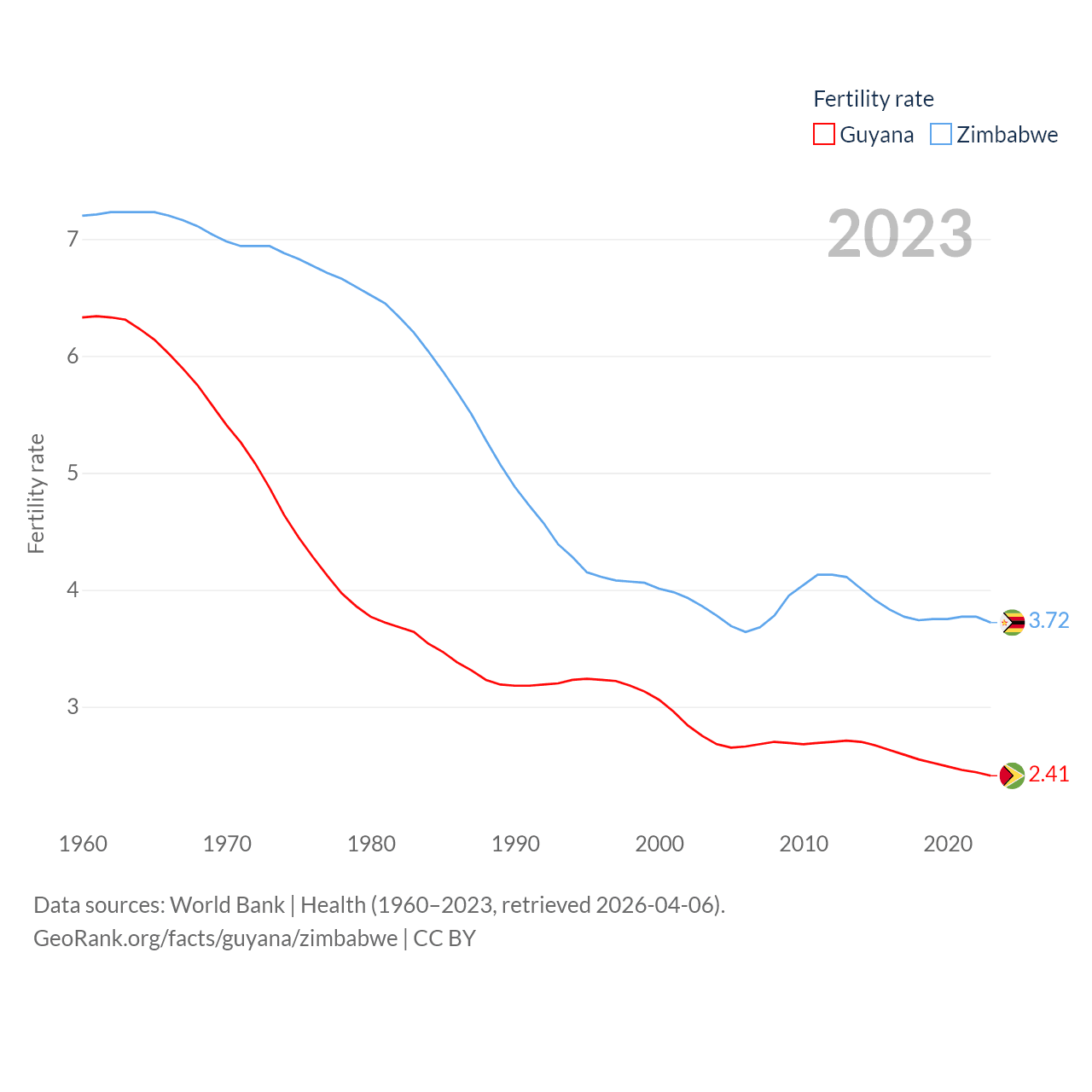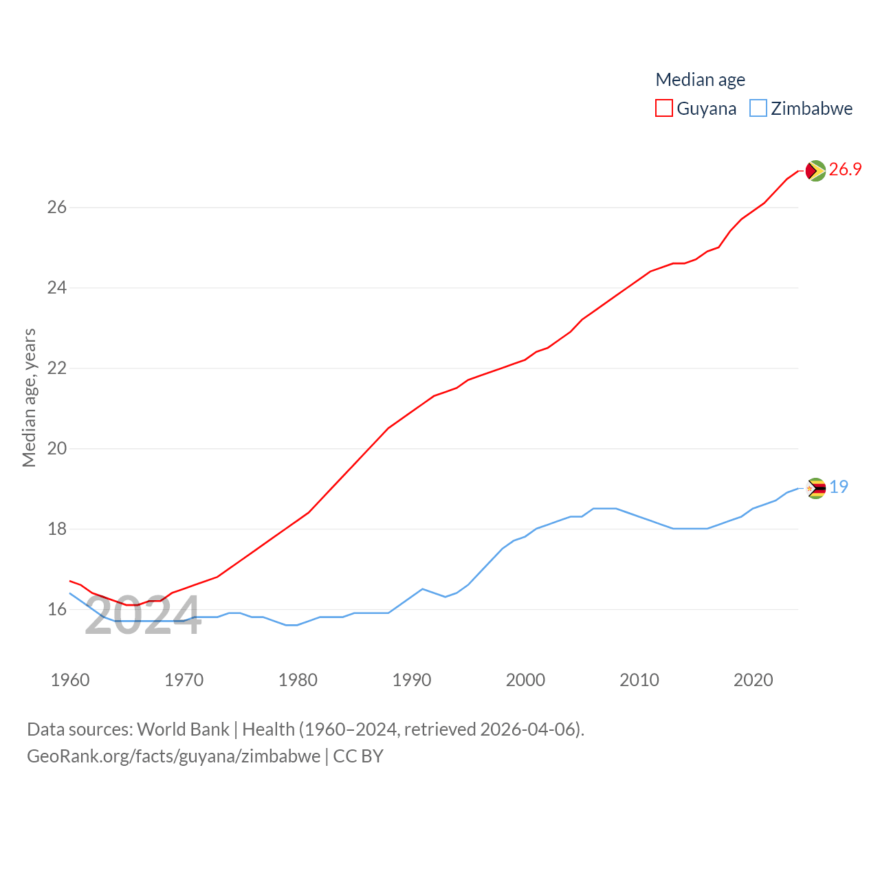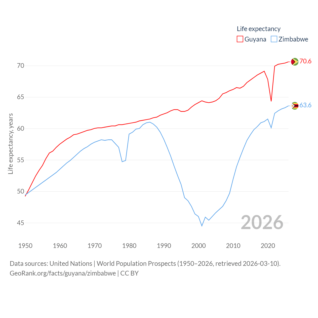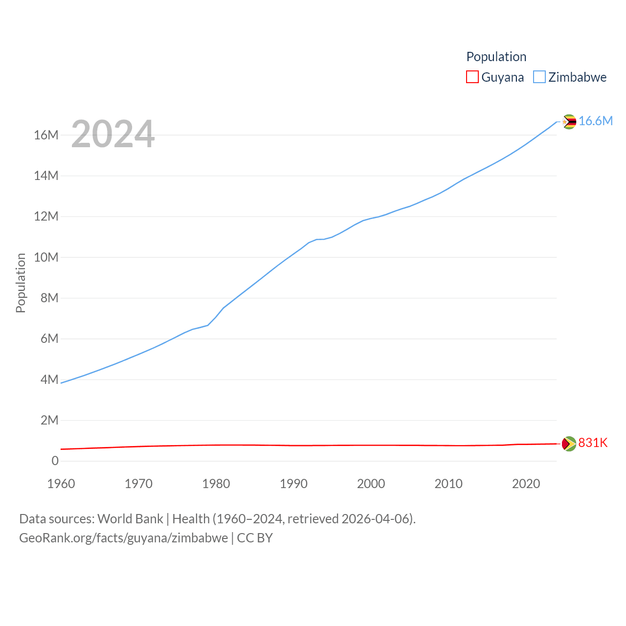 Guyana has a population of 831K (ranked 161/197), compared with 16.6M in Zimbabwe (ranked 74/197). Guyana's land area is 81,522 sq mi versus 149,364 sq mi for Zimbabwe (ranked 82nd vs. 60th).