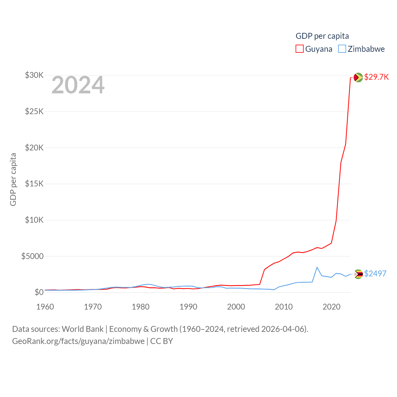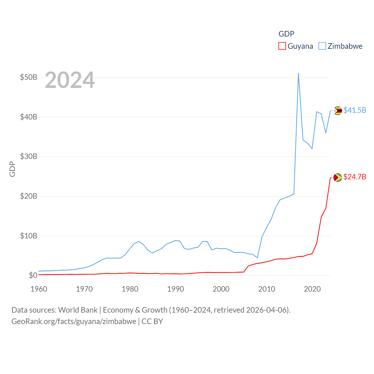 By GDP, Guyana ranks 120/197 ($24.7B) and Zimbabwe ranks 102/197 ($41.5B). By GDP per capita, Guyana ranks 41/197 ($29,675), while Zimbabwe ranks 148/197 ($2,497).
