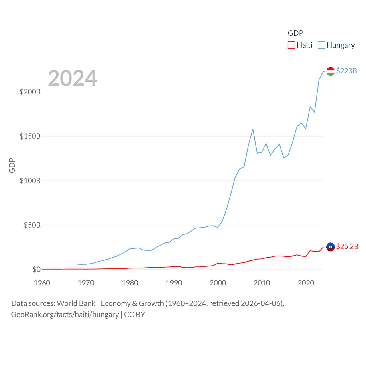 By GDP, Haiti ranks 117/197 ($25.2B) and Hungary ranks 55/197 ($223B). By GDP per capita, Haiti ranks 153/197 ($2,143), while Hungary ranks 55/197 ($23,292).