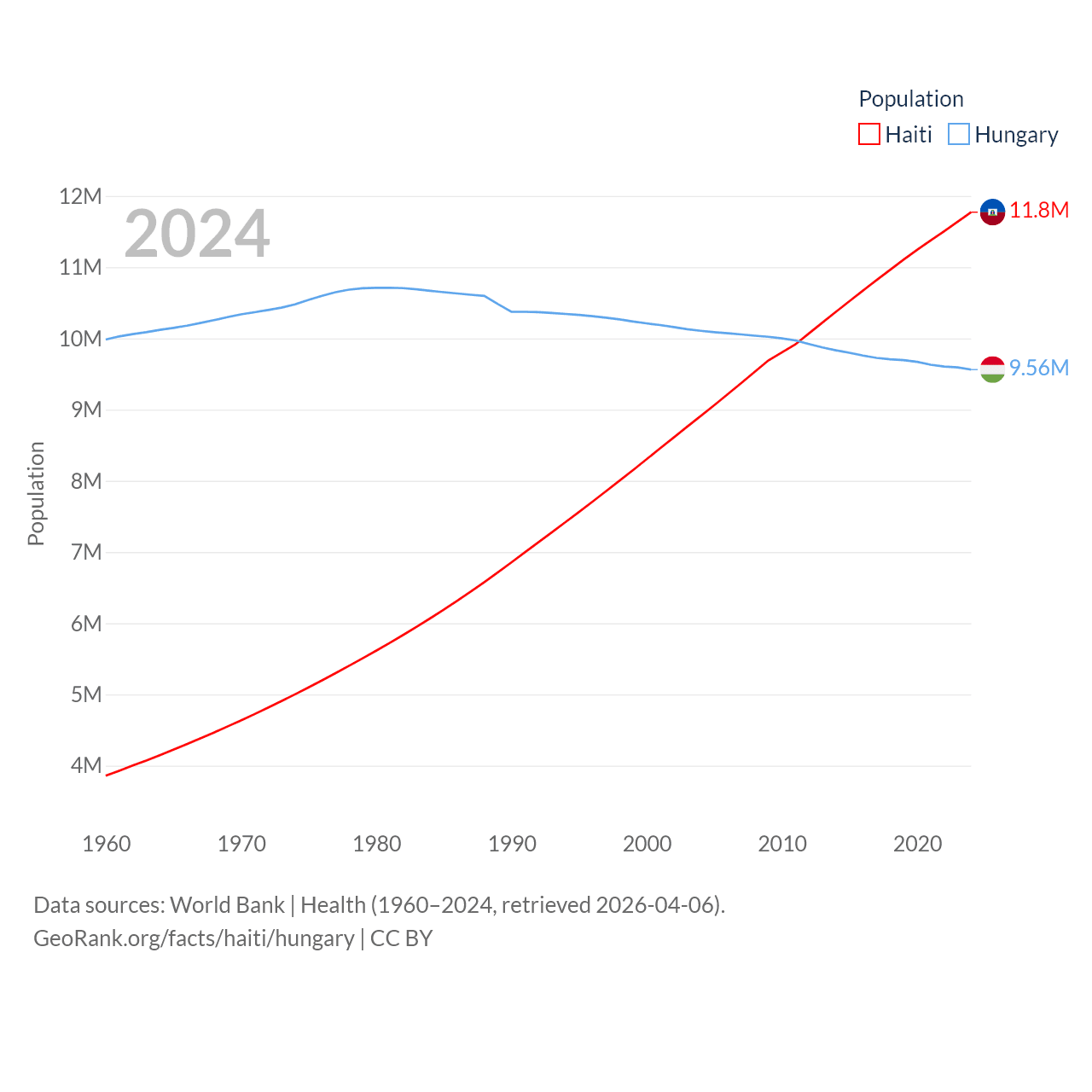 Haiti has a population of 11.8M (ranked 83/197), compared with 9.56M in Hungary (ranked 97/197). Haiti's land area is 10,641 sq mi versus 35,236 sq mi for Hungary (ranked 142nd vs. 109th).