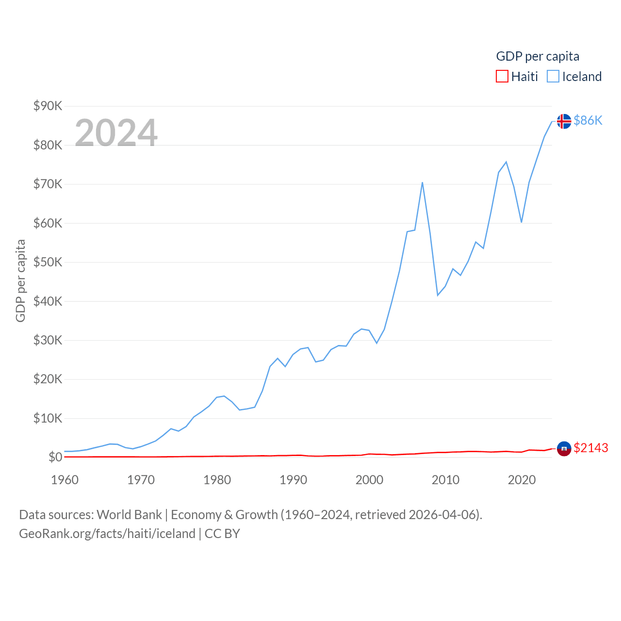 By GDP, Haiti ranks 117/197 ($25.2B) and Iceland ranks 108/197 ($33.3B). By GDP per capita, Haiti ranks 153/197 ($2,143), while Iceland ranks 9/197 ($86,041).