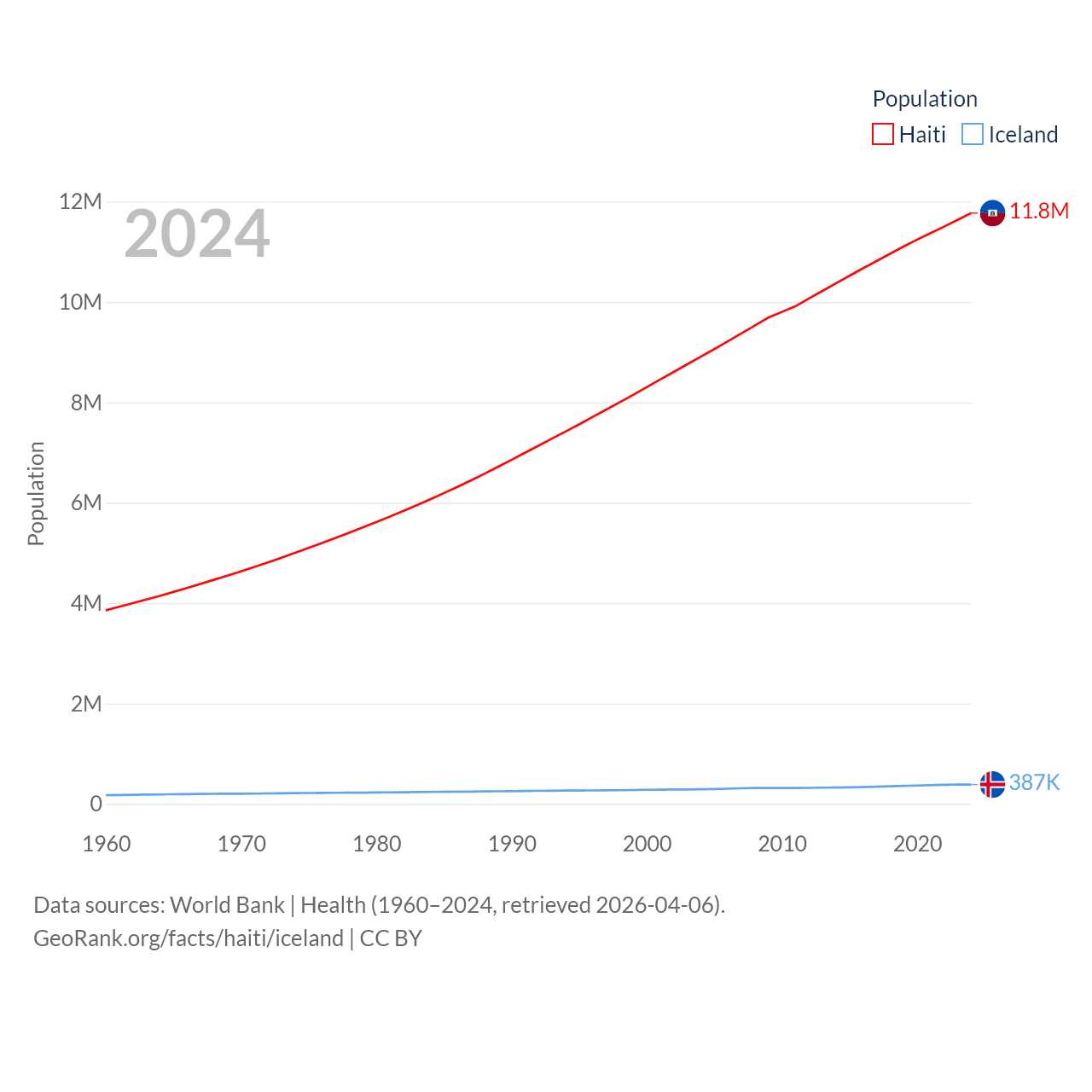 Haiti has a population of 11.8M (ranked 83/197), compared with 387K in Iceland (ranked 173/197). Haiti's land area is 10,641 sq mi versus 38,931 sq mi for Iceland (ranked 142nd vs. 104th).