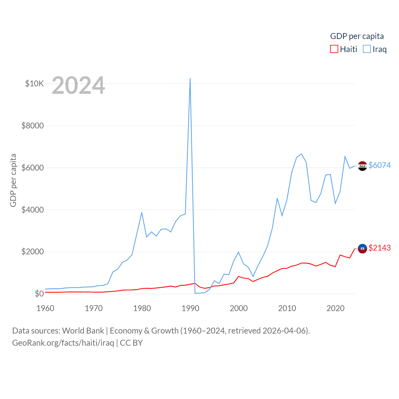 By GDP, Haiti ranks 117/197 ($25.2B) and Iraq ranks 50/197 ($280B). By GDP per capita, Haiti ranks 153/197 ($2,143), while Iraq ranks 113/197 ($6,074).