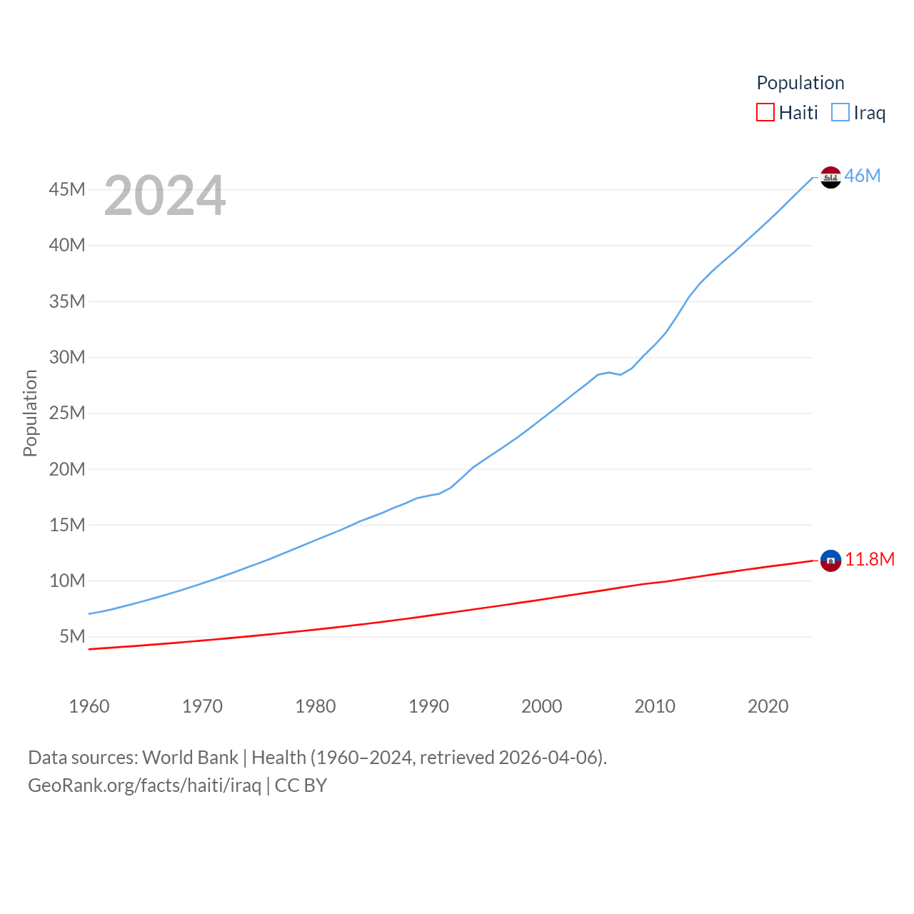 Haiti has a population of 11.8M (ranked 83/197), compared with 46M in Iraq (ranked 34/197). Haiti's land area is 10,641 sq mi versus 167,619 sq mi for Iraq (ranked 142nd vs. 57th).