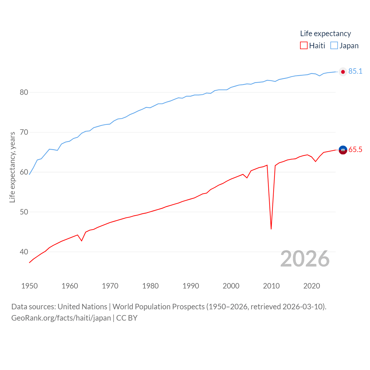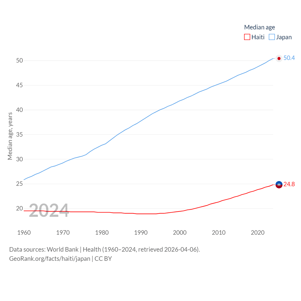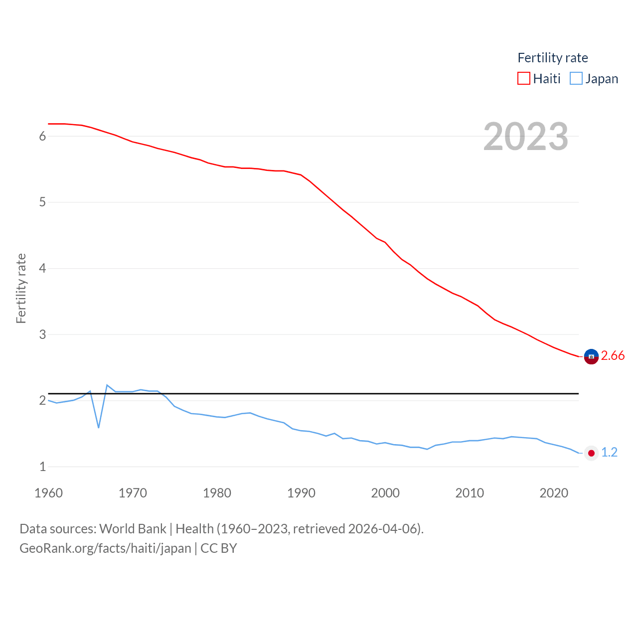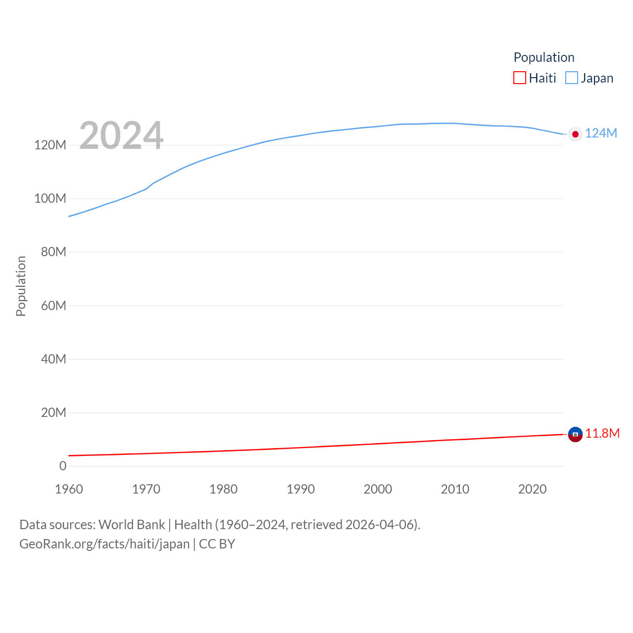 Haiti has a population of 11.8M (ranked 83/197), compared with 124M in Japan (ranked 12/197). Haiti's land area is 10,641 sq mi versus 140,761 sq mi for Japan (ranked 142nd vs. 61st).