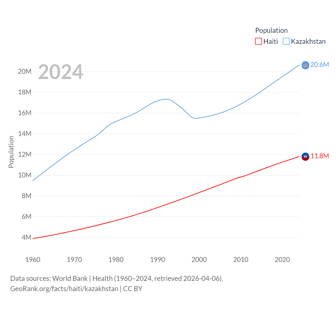 Haiti has a population of 11.8M (ranked 83/197), compared with 20.6M in Kazakhstan (ranked 64/197). Haiti's land area is 10,641 sq mi versus 1,042,360 sq mi for Kazakhstan (ranked 142nd vs. 9th).
