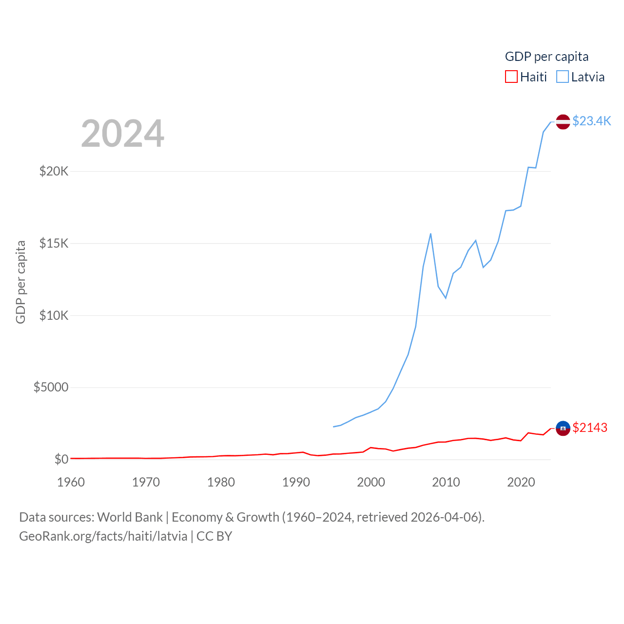 By GDP, Haiti ranks 117/197 ($25.2B) and Latvia ranks 99/197 ($43.7B). By GDP per capita, Haiti ranks 153/197 ($2,143), while Latvia ranks 54/197 ($23,409).