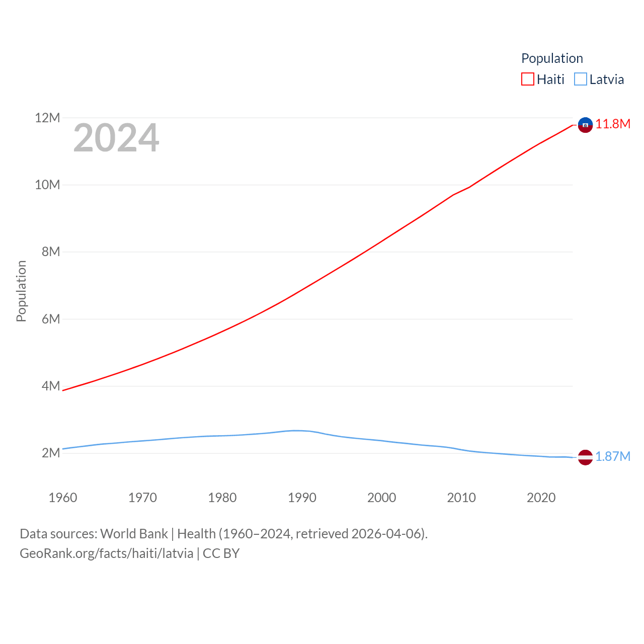 Haiti has a population of 11.8M (ranked 83/197), compared with 1.87M in Latvia (ranked 149/197). Haiti's land area is 10,641 sq mi versus 24,027 sq mi for Latvia (ranked 142nd vs. 121st).