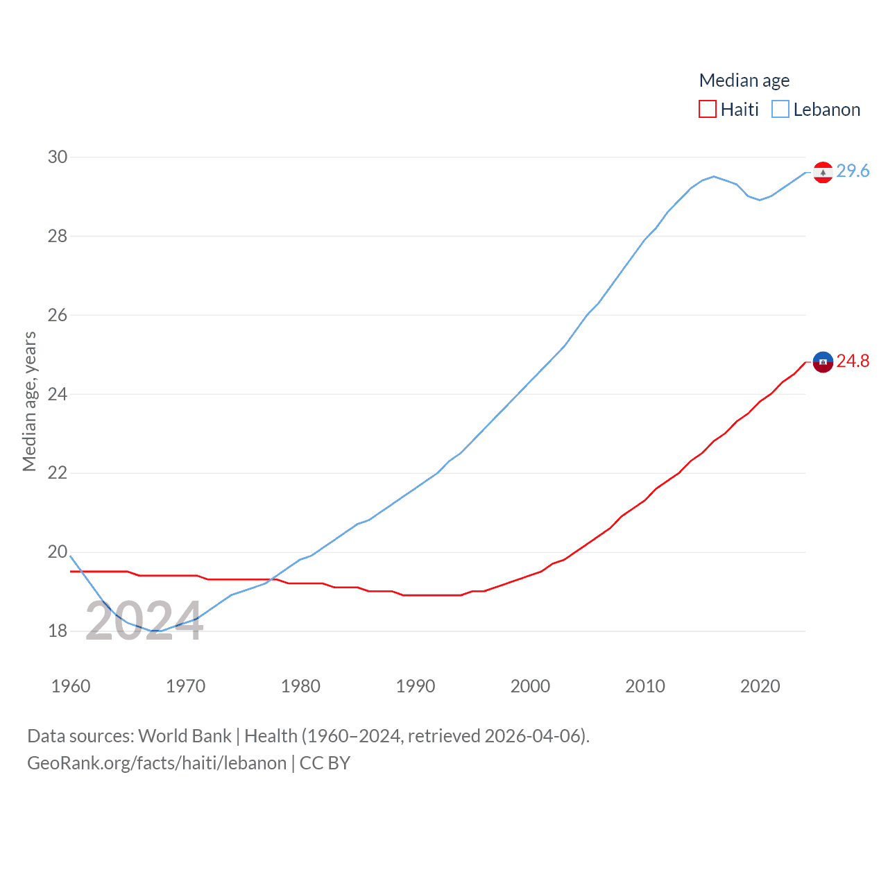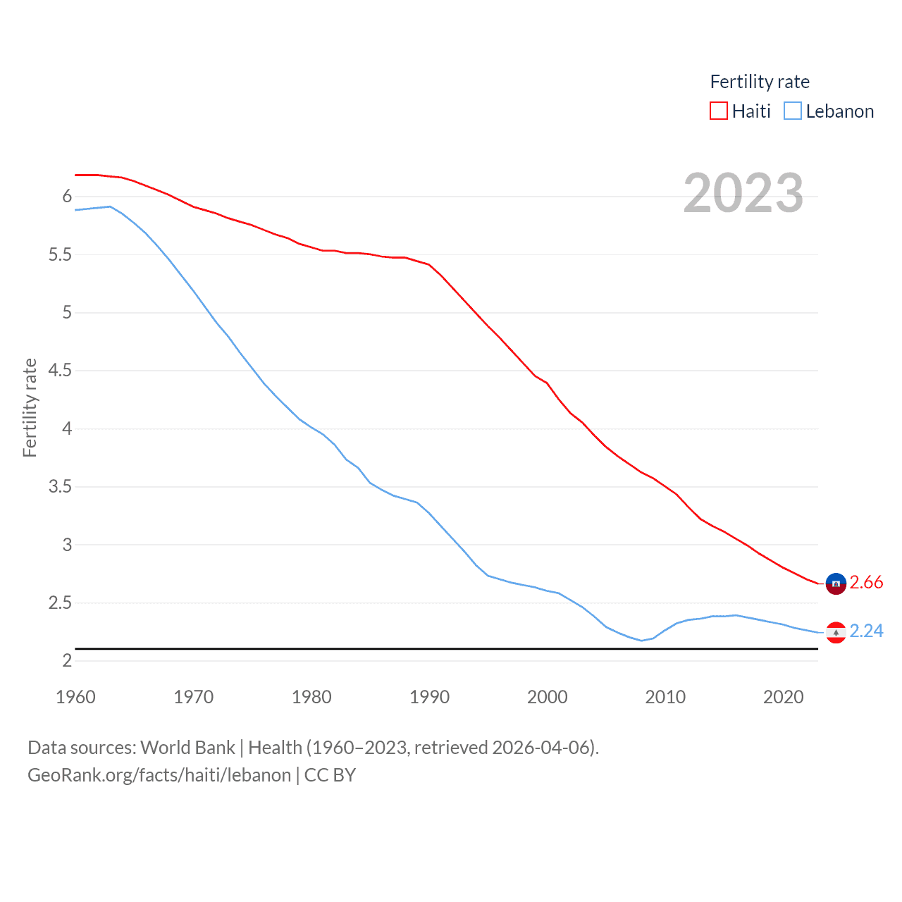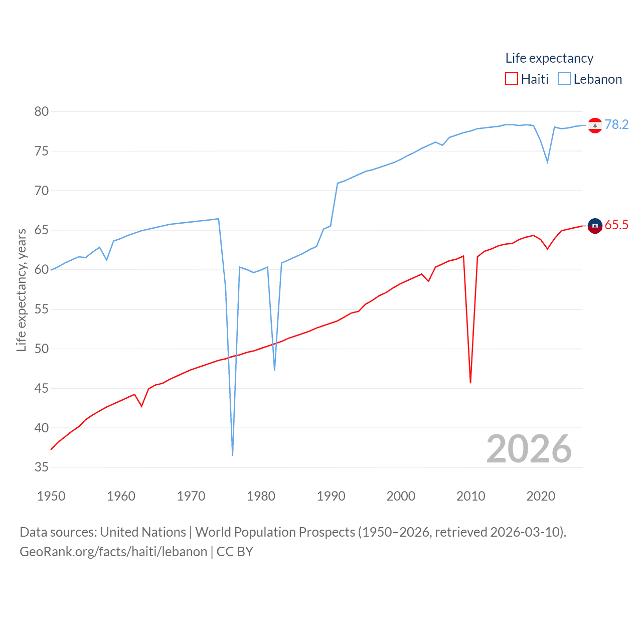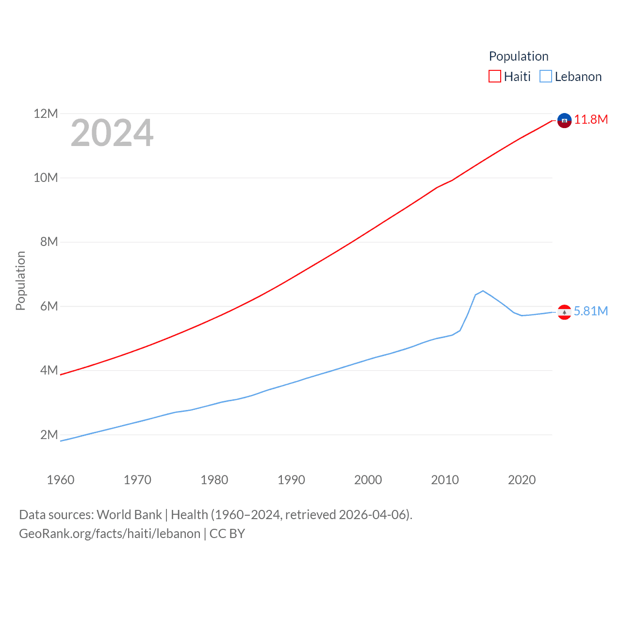 Haiti has a population of 11.8M (ranked 83/197), compared with 5.81M in Lebanon (ranked 115/197). Haiti's land area is 10,641 sq mi versus 3,950 sq mi for Lebanon (ranked 142nd vs. 160th).
