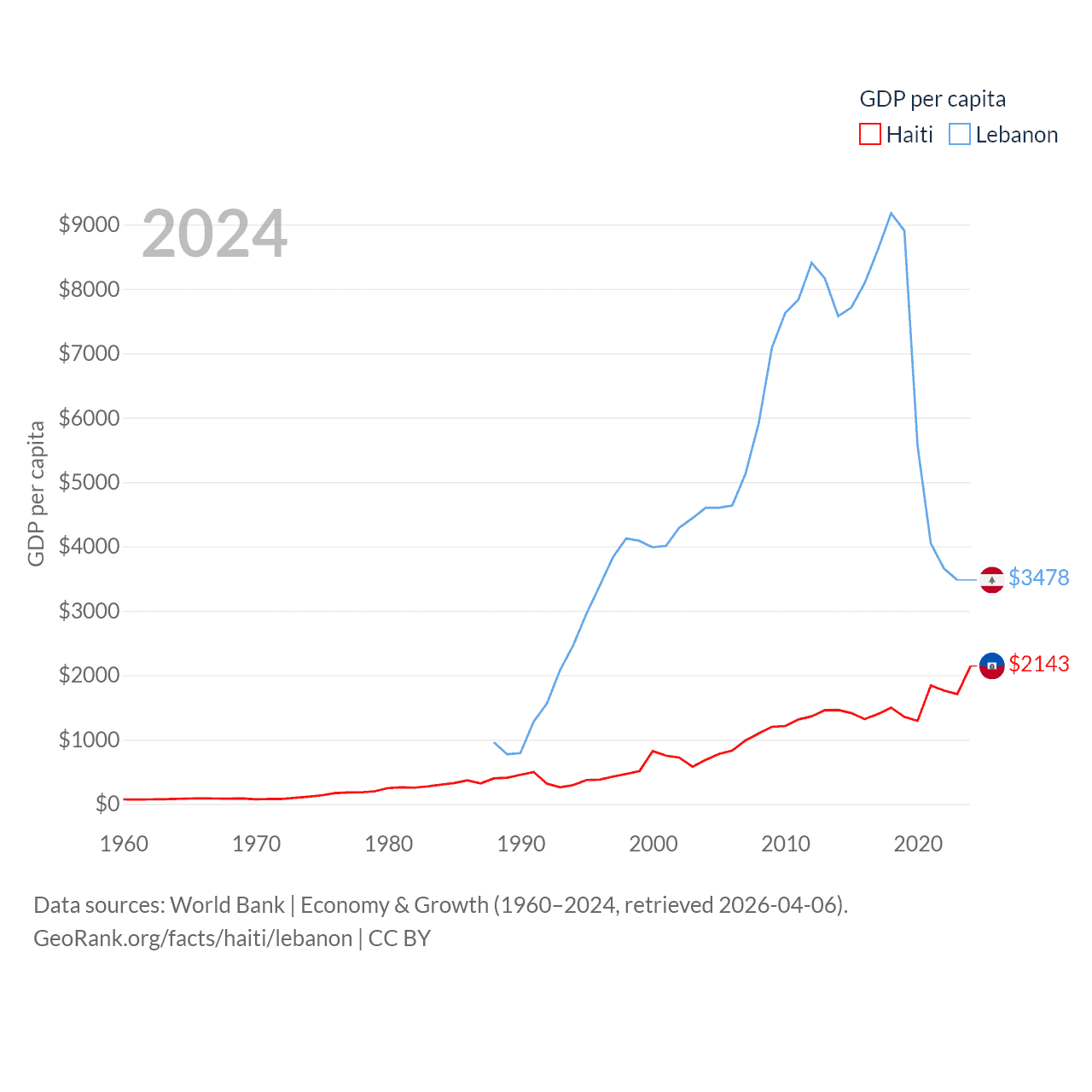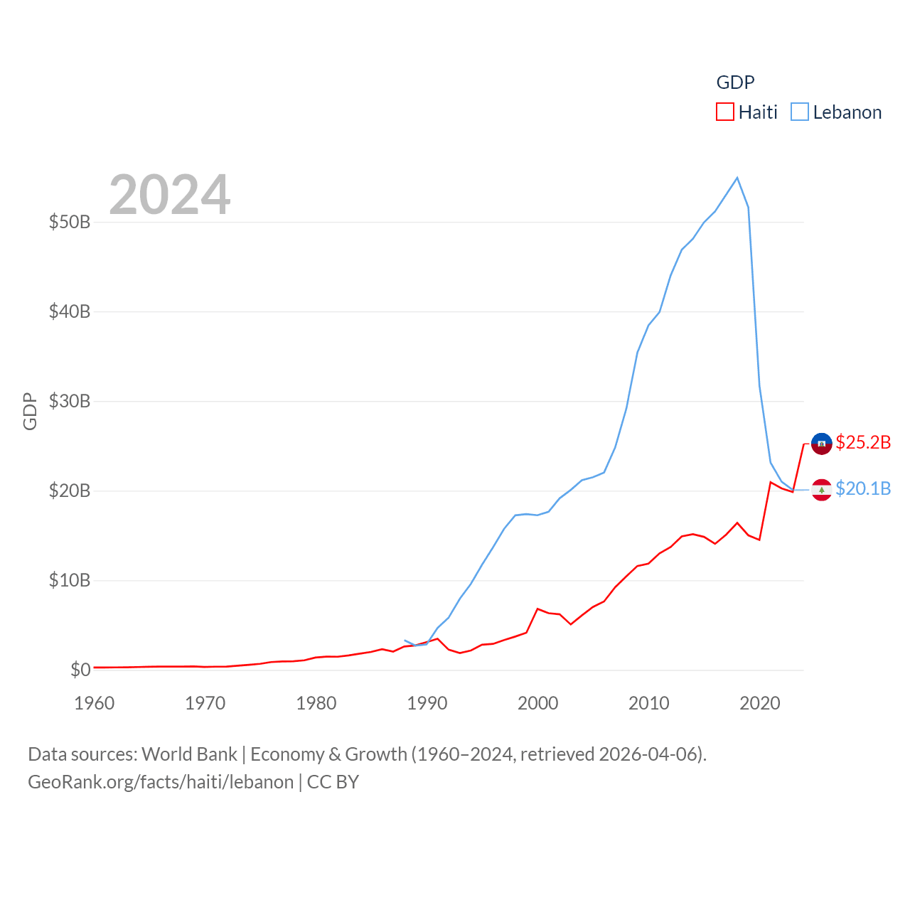 By GDP, Haiti ranks 117/197 ($25.2B) and Lebanon ranks 128/197 ($20.1B). By GDP per capita, Haiti ranks 153/197 ($2,143), while Lebanon ranks 135/197 ($3,478).