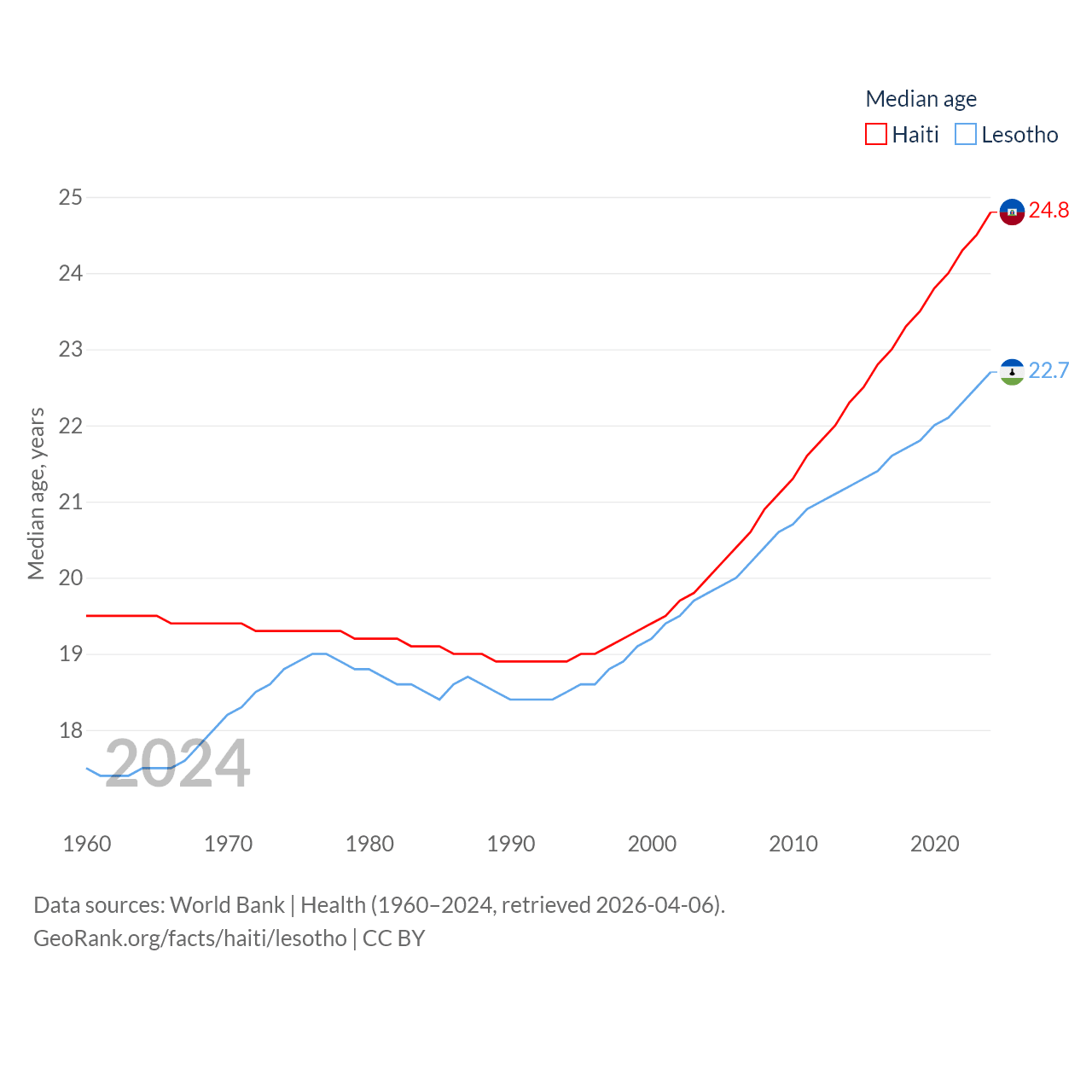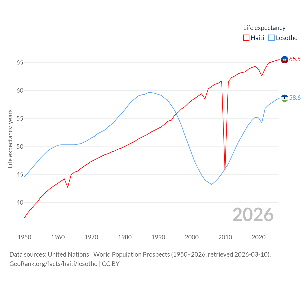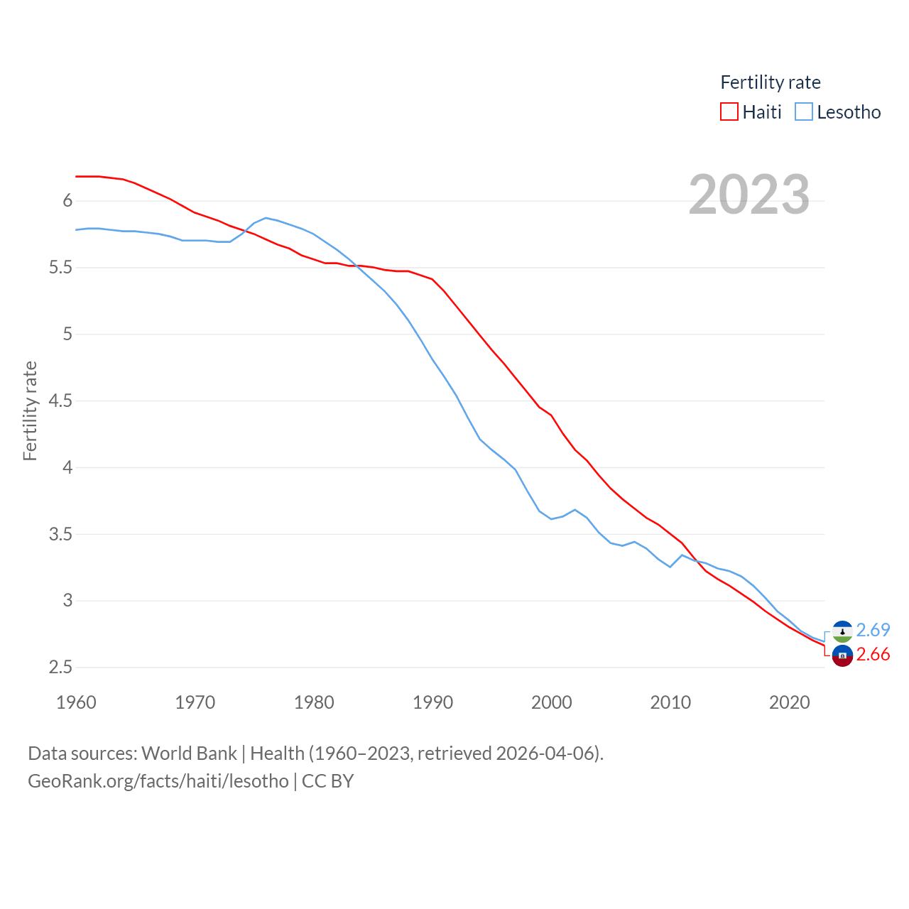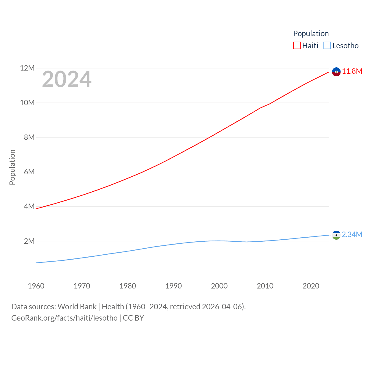 Haiti has a population of 11.8M (ranked 83/197), compared with 2.34M in Lesotho (ranked 145/197). Haiti's land area is 10,641 sq mi versus 11,722 sq mi for Lesotho (ranked 142nd vs. 137th).