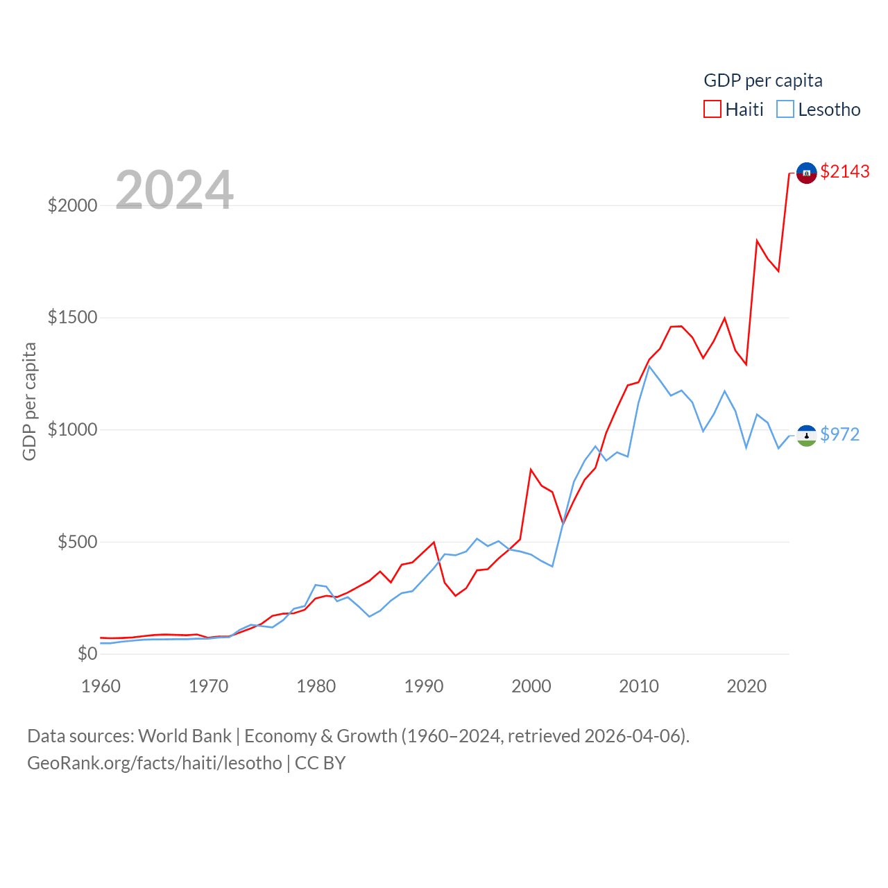 By GDP, Haiti ranks 117/197 ($25.2B) and Lesotho ranks 175/197 ($2.27B). By GDP per capita, Haiti ranks 153/197 ($2,143), while Lesotho ranks 181/197 ($972).