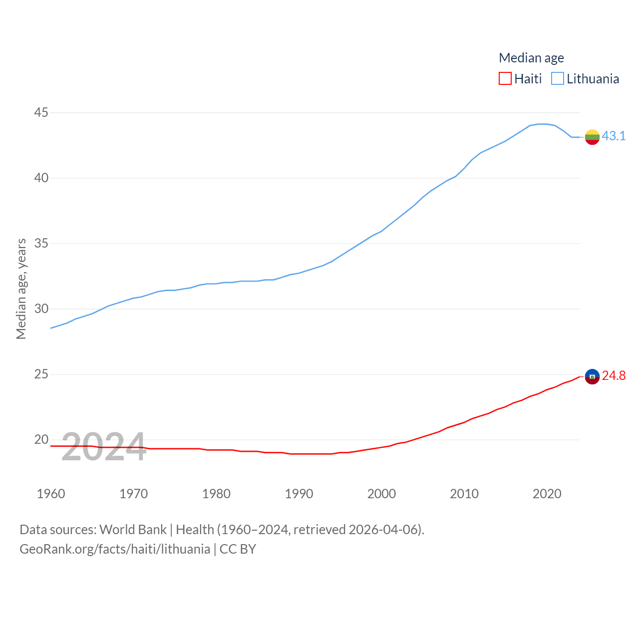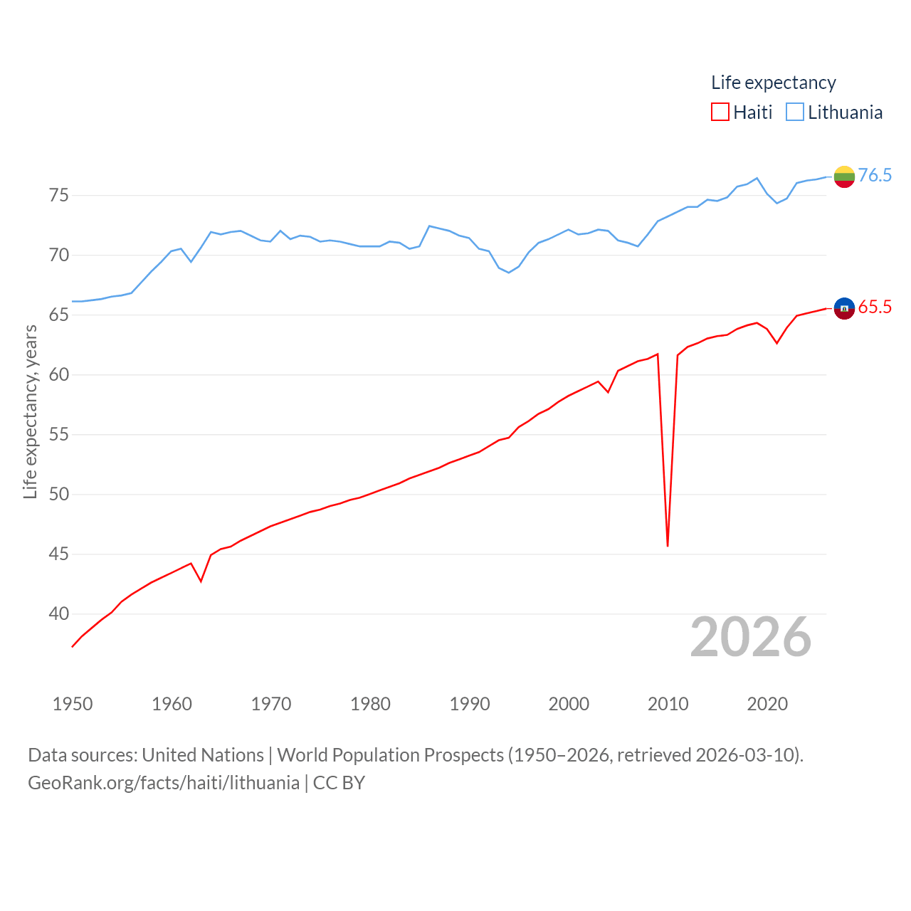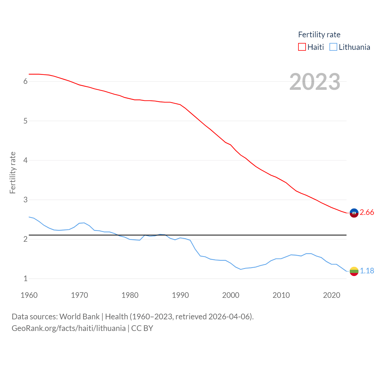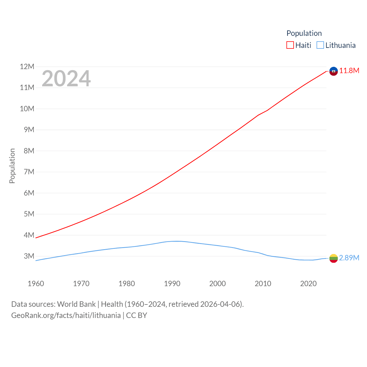 Haiti has a population of 11.8M (ranked 83/197), compared with 2.89M in Lithuania (ranked 137/197). Haiti's land area is 10,641 sq mi versus 24,170 sq mi for Lithuania (ranked 142nd vs. 120th).