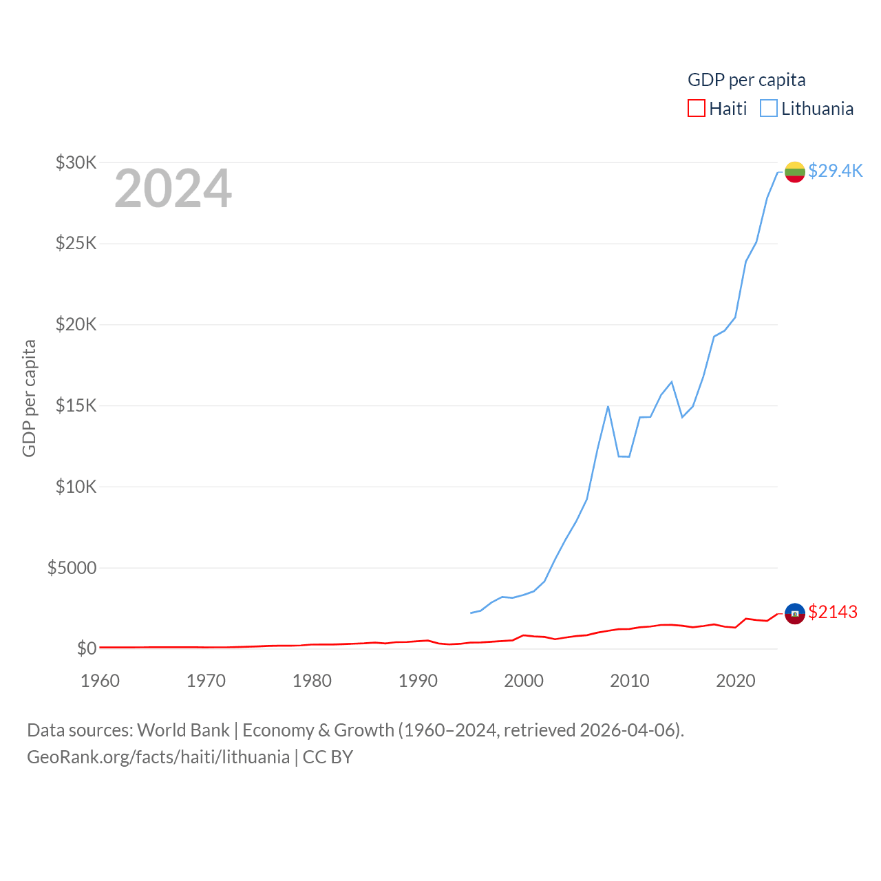By GDP, Haiti ranks 117/197 ($25.2B) and Lithuania ranks 79/197 ($84.9B). By GDP per capita, Haiti ranks 153/197 ($2,143), while Lithuania ranks 43/197 ($29,384).