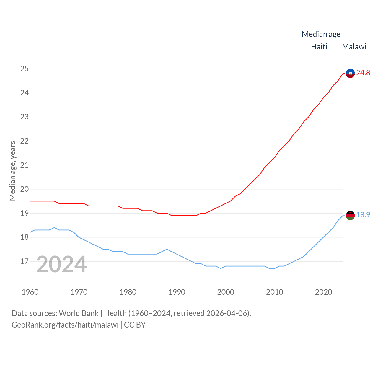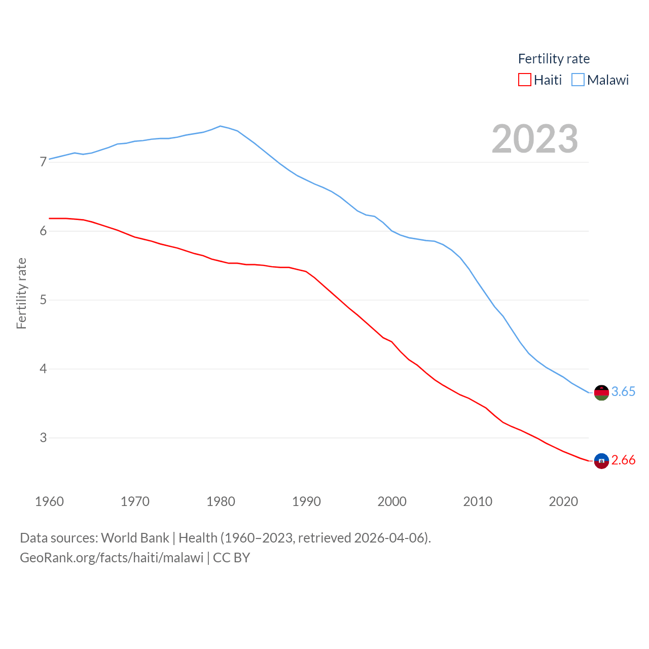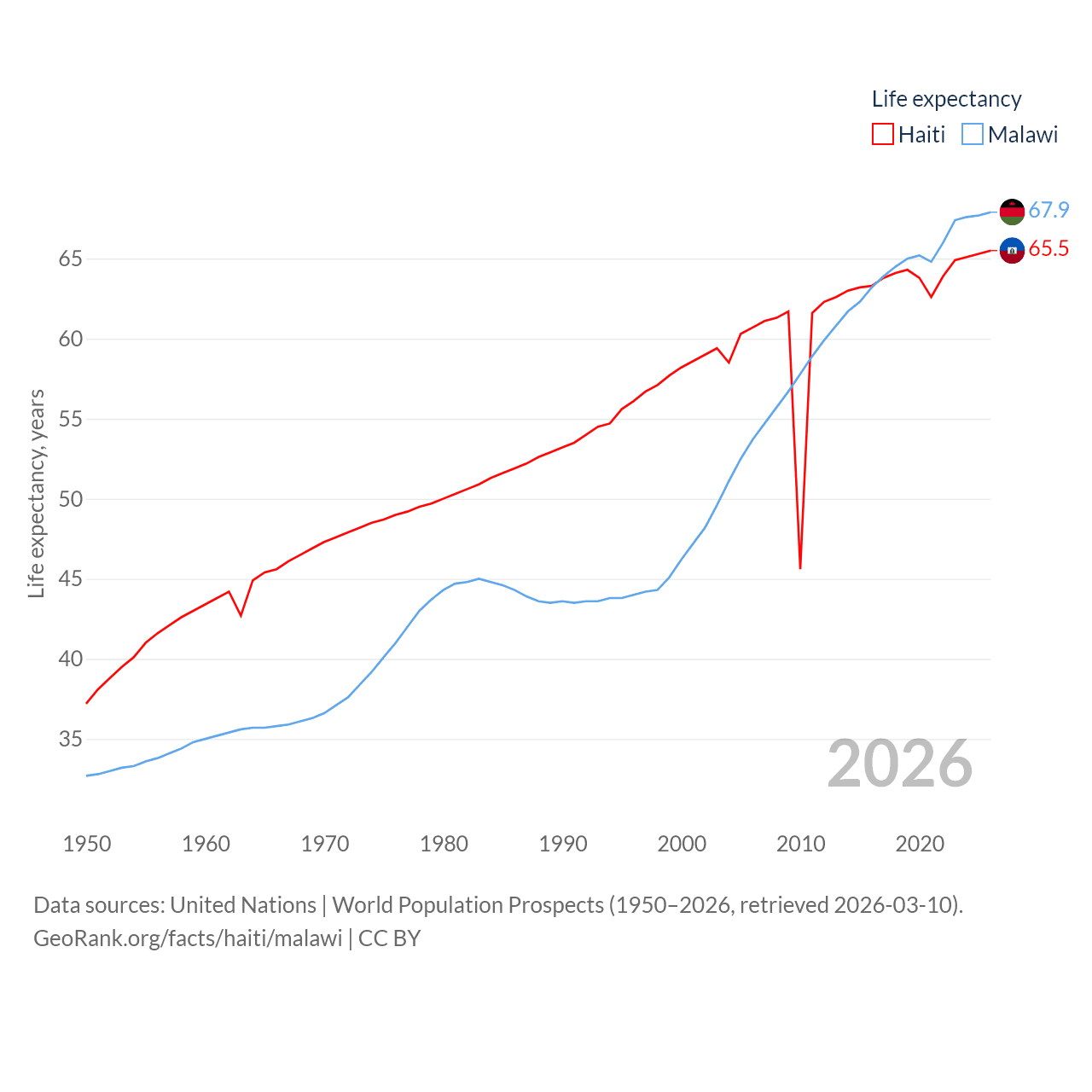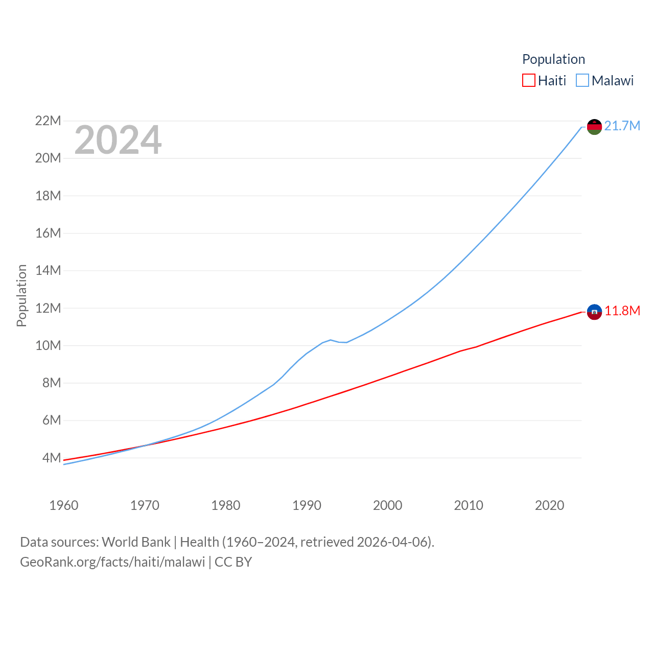 Haiti has a population of 11.8M (ranked 83/197), compared with 21.7M in Malawi (ranked 62/197). Haiti's land area is 10,641 sq mi versus 36,402 sq mi for Malawi (ranked 142nd vs. 107th).