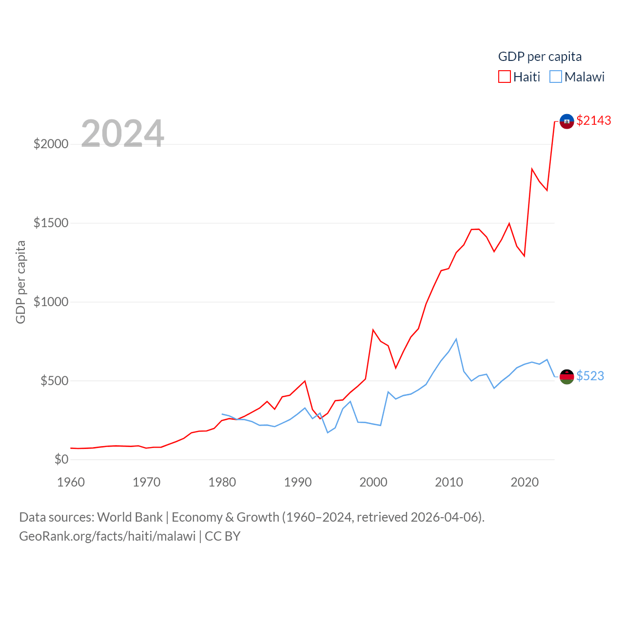 By GDP, Haiti ranks 117/197 ($25.2B) and Malawi ranks 151/197 ($11.3B). By GDP per capita, Haiti ranks 153/197 ($2,143), while Malawi ranks 194/197 ($523).