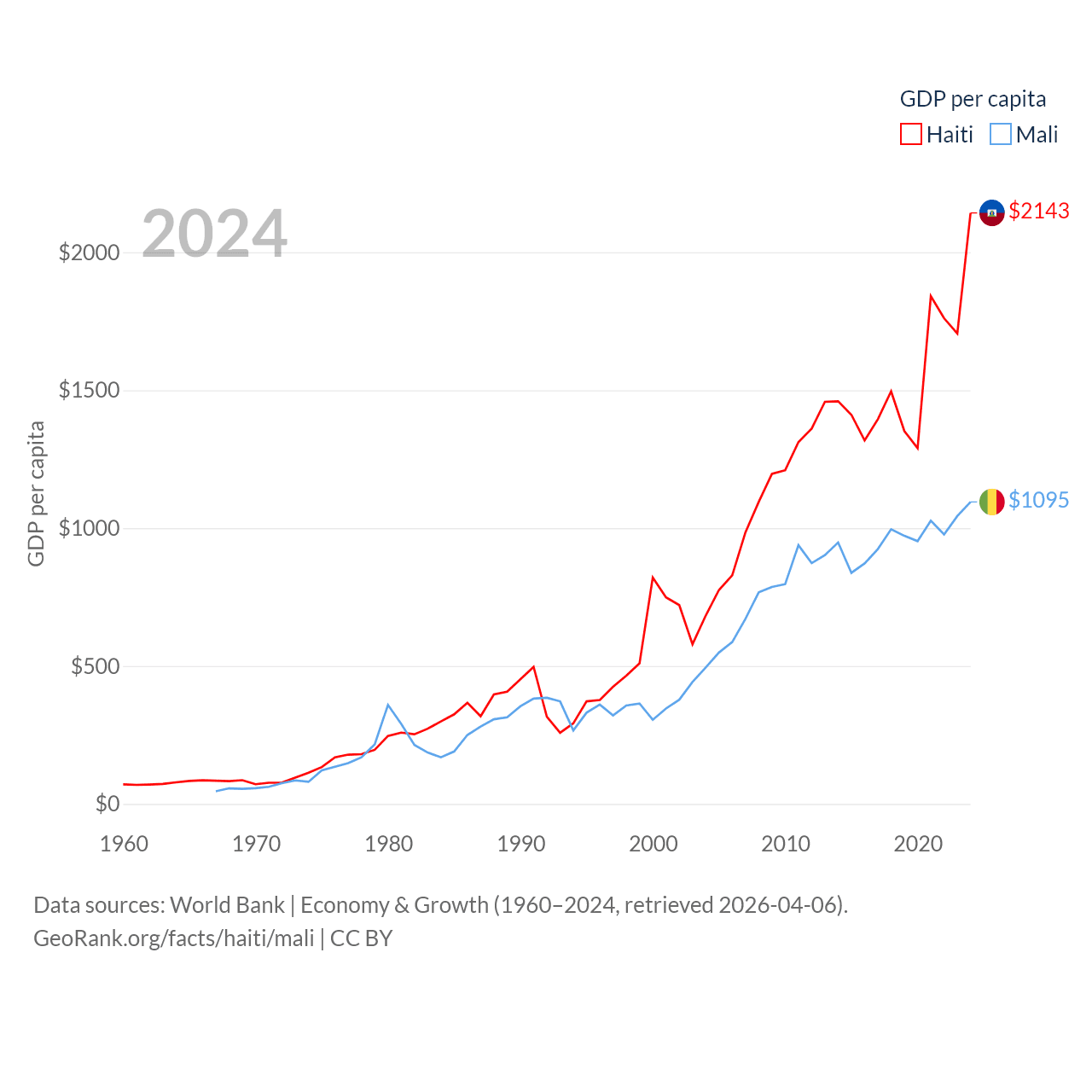 By GDP, Haiti ranks 117/197 ($25.2B) and Mali ranks 113/197 ($26.8B). By GDP per capita, Haiti ranks 153/197 ($2,143), while Mali ranks 173/197 ($1,095).
