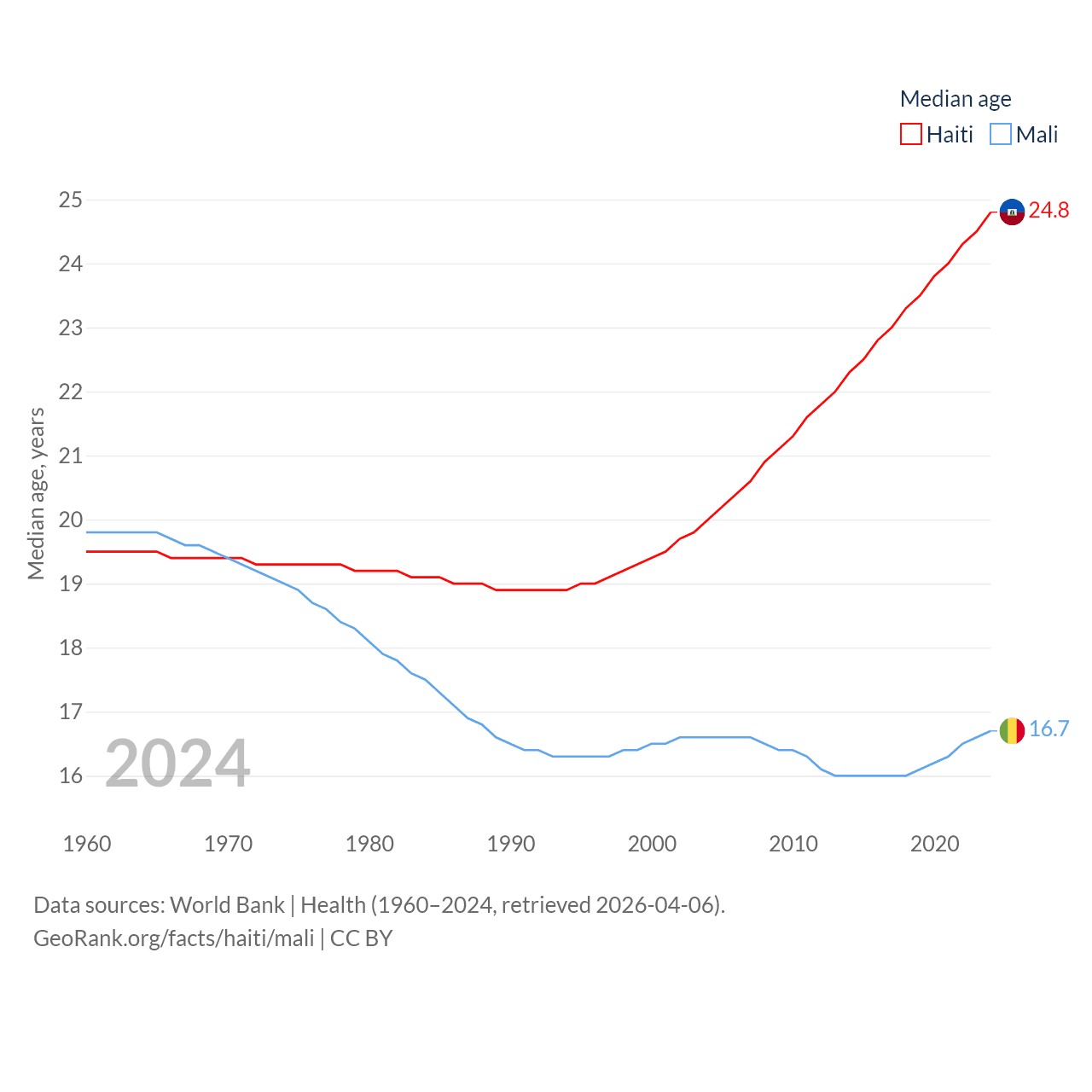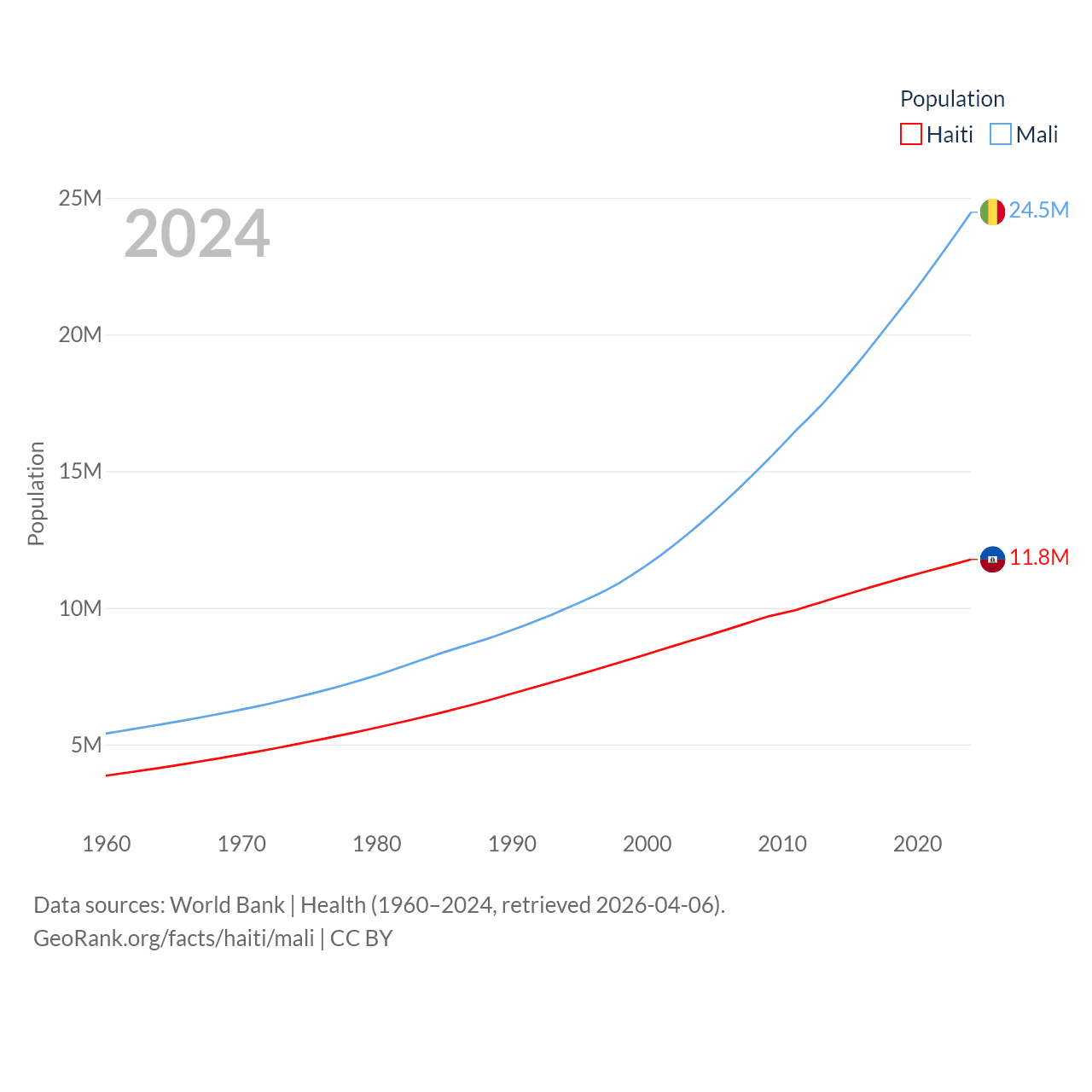 Haiti has a population of 11.8M (ranked 83/197), compared with 24.5M in Mali (ranked 58/197). Haiti's land area is 10,641 sq mi versus 471,118 sq mi for Mali (ranked 142nd vs. 23rd).