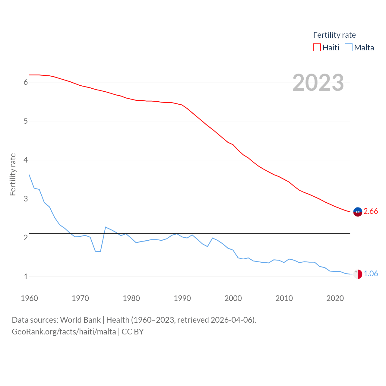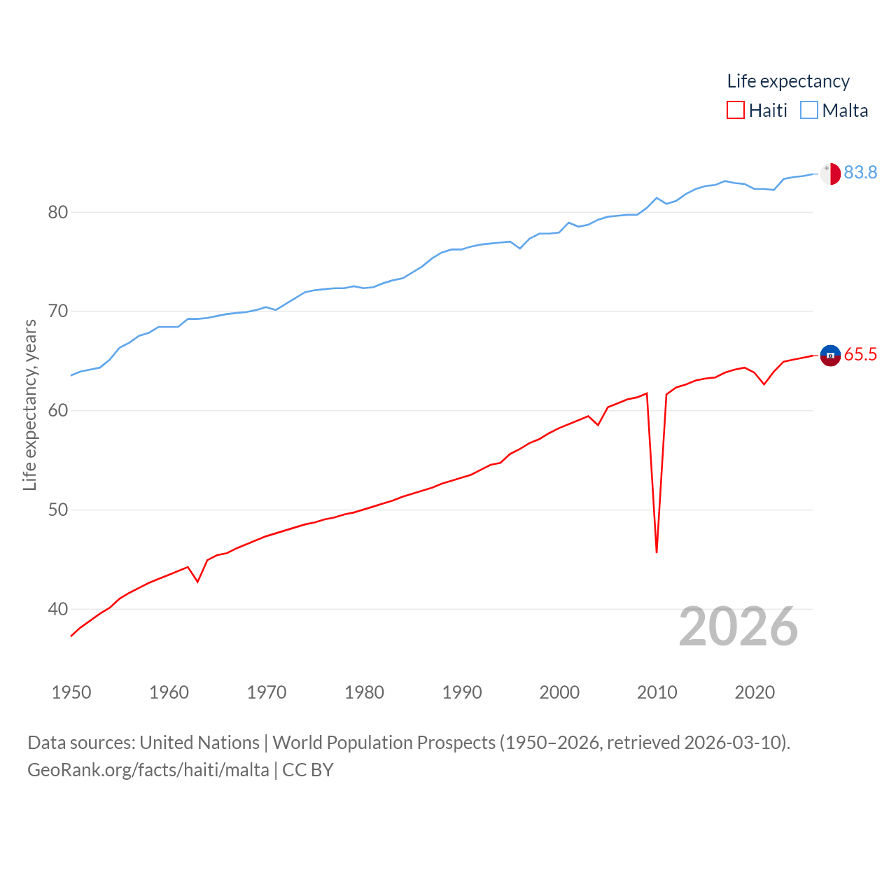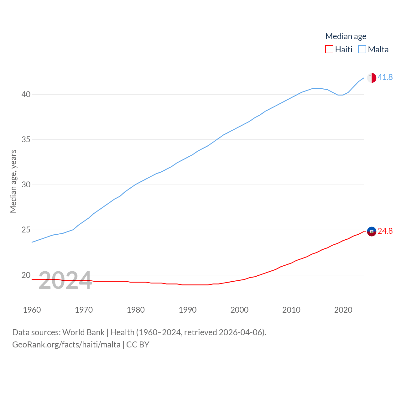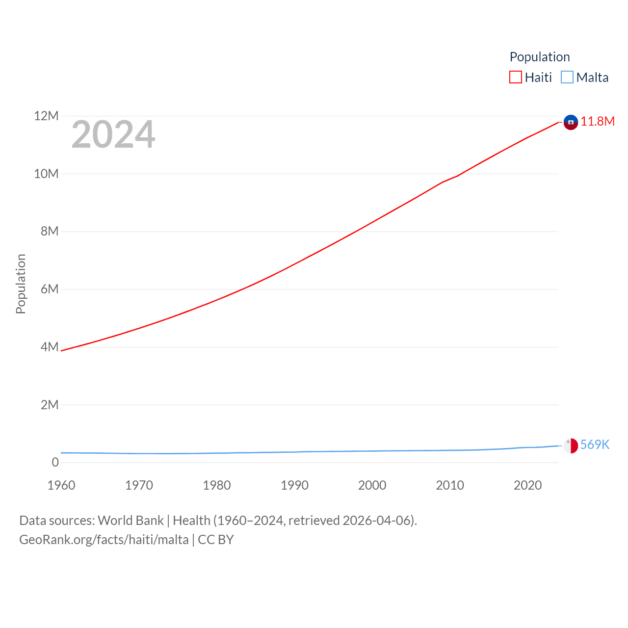 Haiti has a population of 11.8M (ranked 83/197), compared with 569K in Malta (ranked 167/197). Haiti's land area is 10,641 sq mi versus 123.6 sq mi for Malta (ranked 142nd vs. 187th).