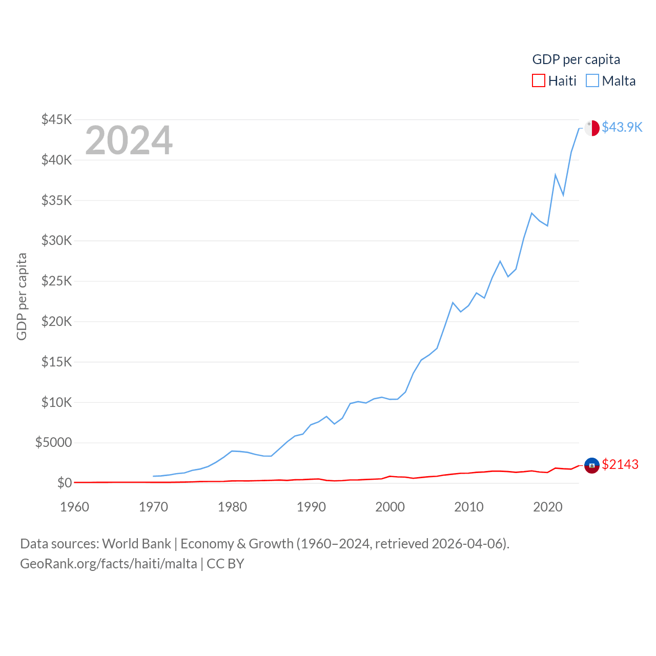 By GDP, Haiti ranks 117/197 ($25.2B) and Malta ranks 119/197 ($25B). By GDP per capita, Haiti ranks 153/197 ($2,143), while Malta ranks 28/197 ($43,899).