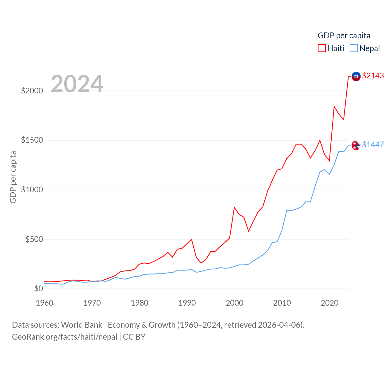 By GDP, Haiti ranks 117/197 ($25.2B) and Nepal ranks 101/197 ($42.9B). By GDP per capita, Haiti ranks 153/197 ($2,143), while Nepal ranks 164/197 ($1,447).